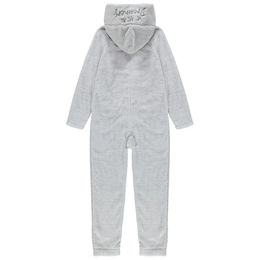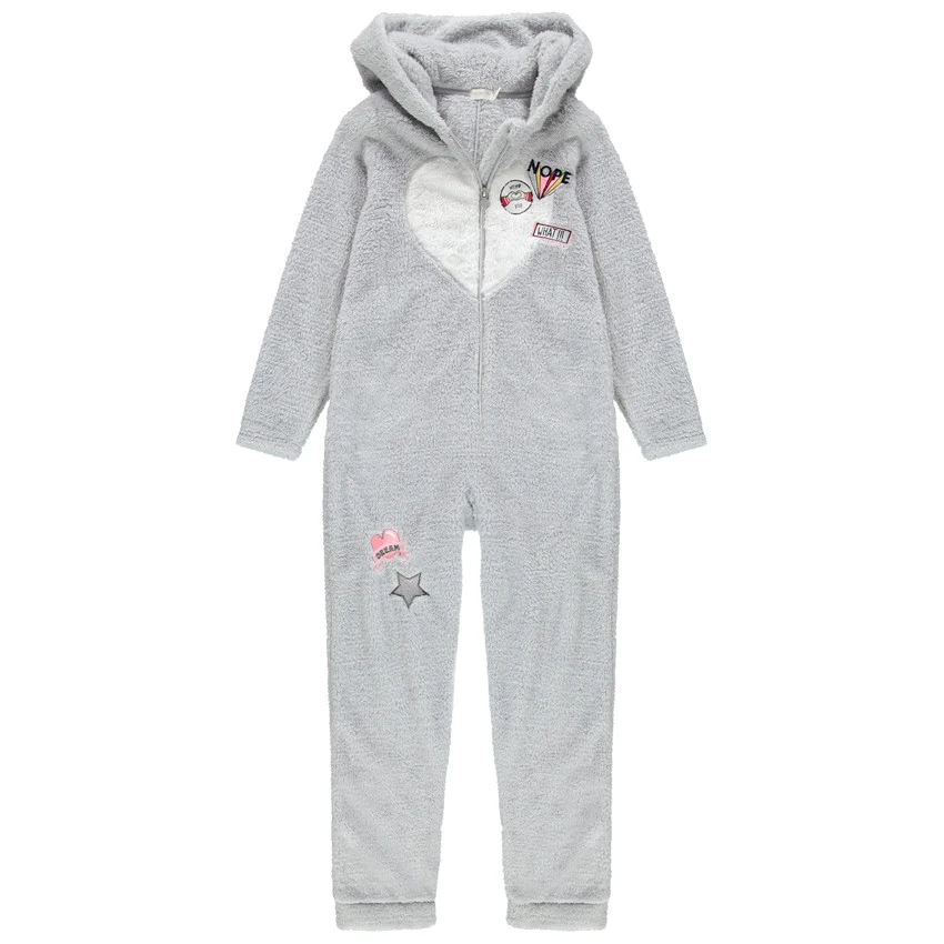 Surpyjama doublée sherpa. Capuche avec inscription brodée. Ouverture zippée sur le devant. Coeur cousu sur le devant. Patch fantaisies brodés.