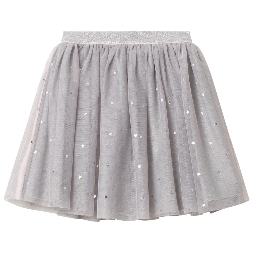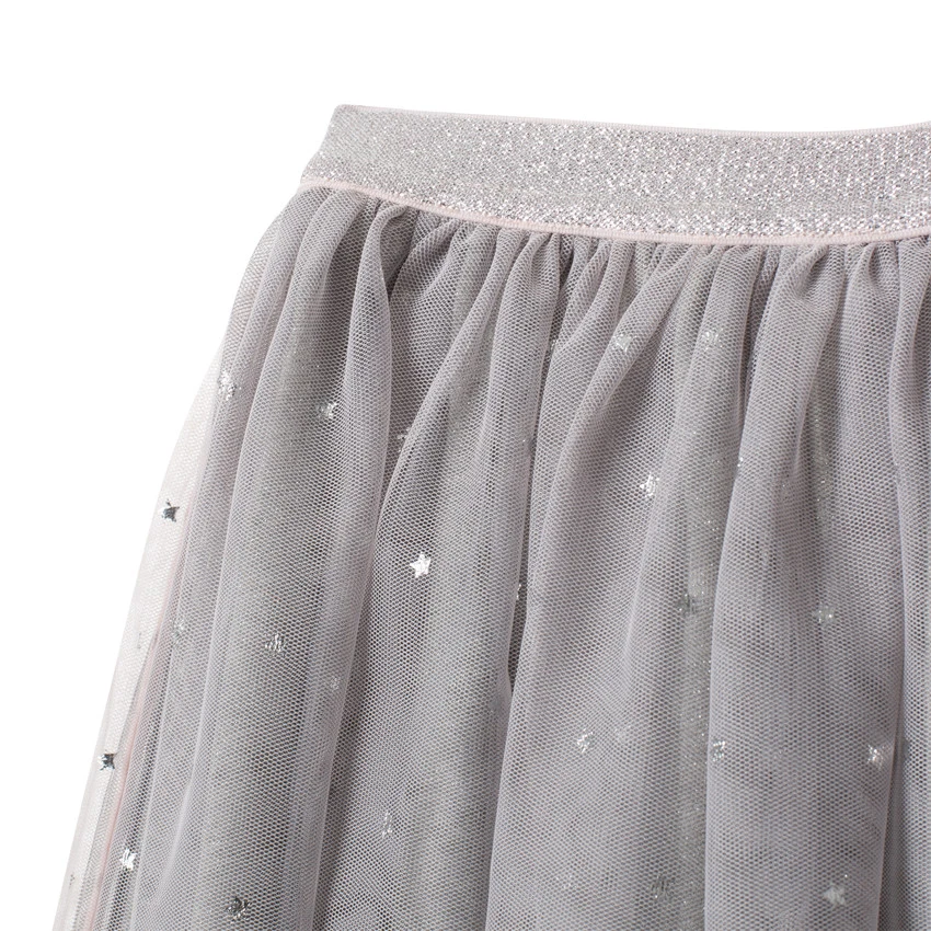 Jupe courte en tulle. Taille élastiquée à paillettes. Motifs étoilées patchées all-over. Doublure intégrée.