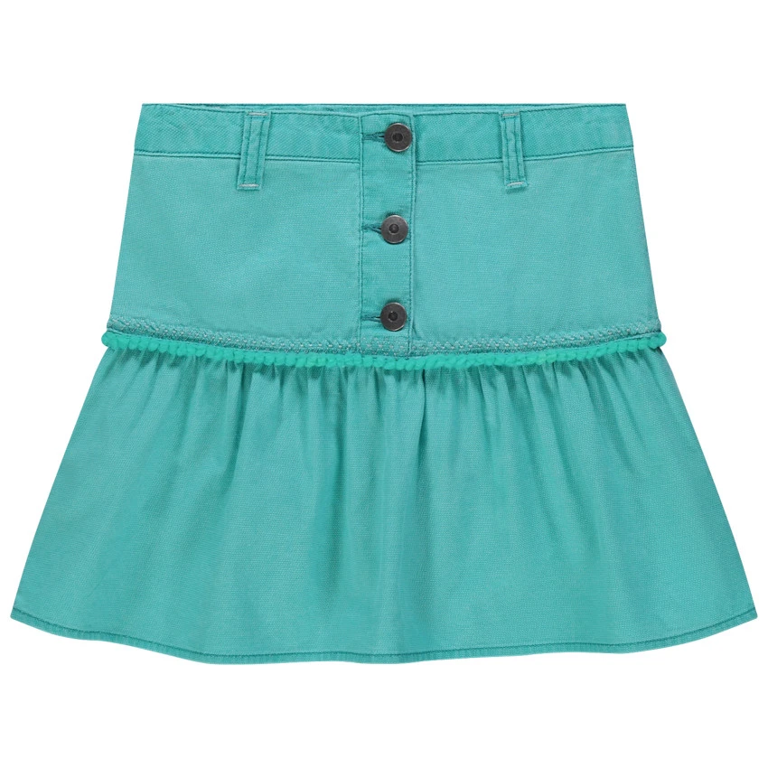 Jupe courte en coton. Taille à passants ajustable de l’intérieur. Ouverture boutonnée devant pour l’enfiler facilement. Découpe avec galon à pompons. Bas de la jupe volanté pour apporter de la légereté.