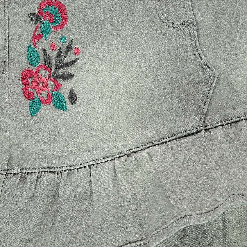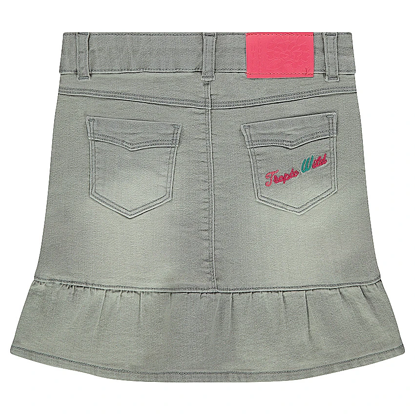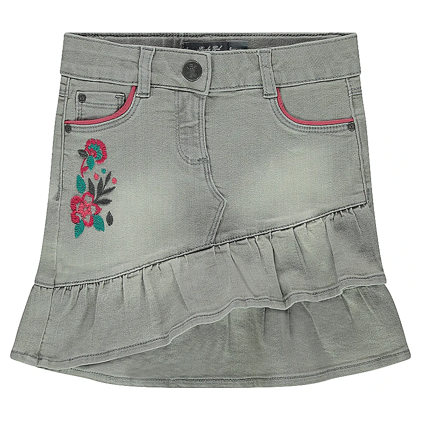 Jupe en jeans effet used. Volants sur le bas de la jupe. Taille ajustable de l’intérieur par élastique et boutons. Ceinture à passants avec bouton et braguette zippée. 2 poches cavalières et 1 poche ticket. Fleurs brodées sur le côté droit. 2 poches plaquées au dos avec inscription brodée.
