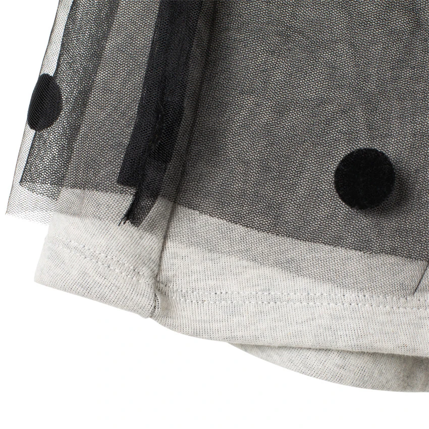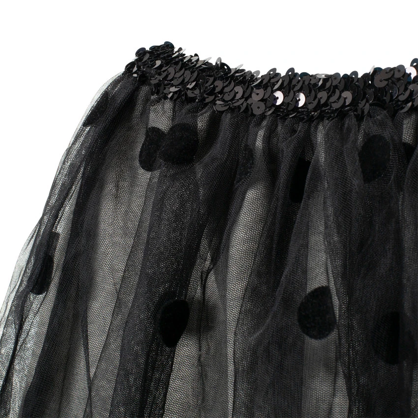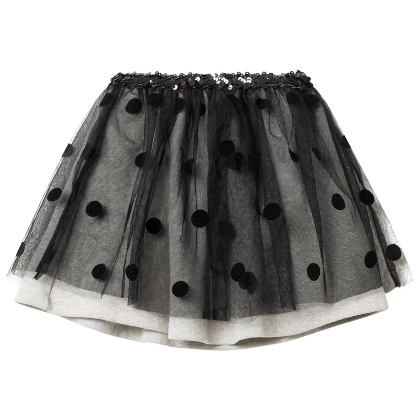 Jupe courte en tulle à pois all-over. Taille élastiquée à sequins. Doublure intégrée.