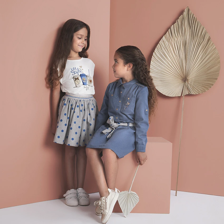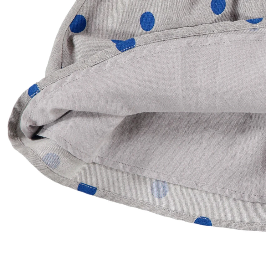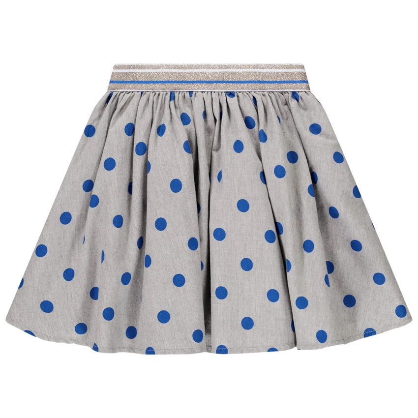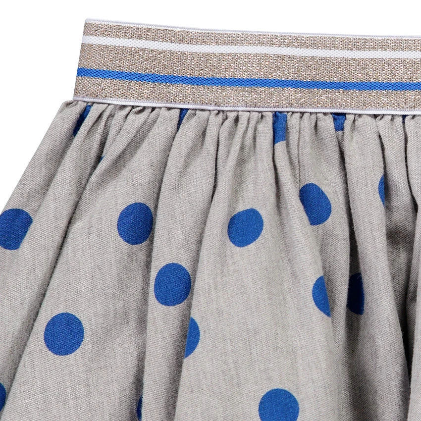 Jupe courte forme patineuse. Taille élastiquée brillante à rayures contrastées. Maille chiné et pois sur l’intégralité de la jupe. Doublure intégrée pour une bonne opacité.