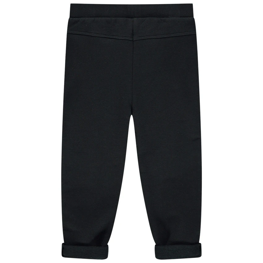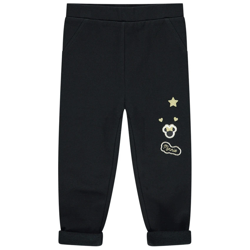 Legging en molleton noir uni. Taille élastiquée pour plus de confort. Patch Minnie fantaisie, broderies et dessins dorés sur la jambe gauche.