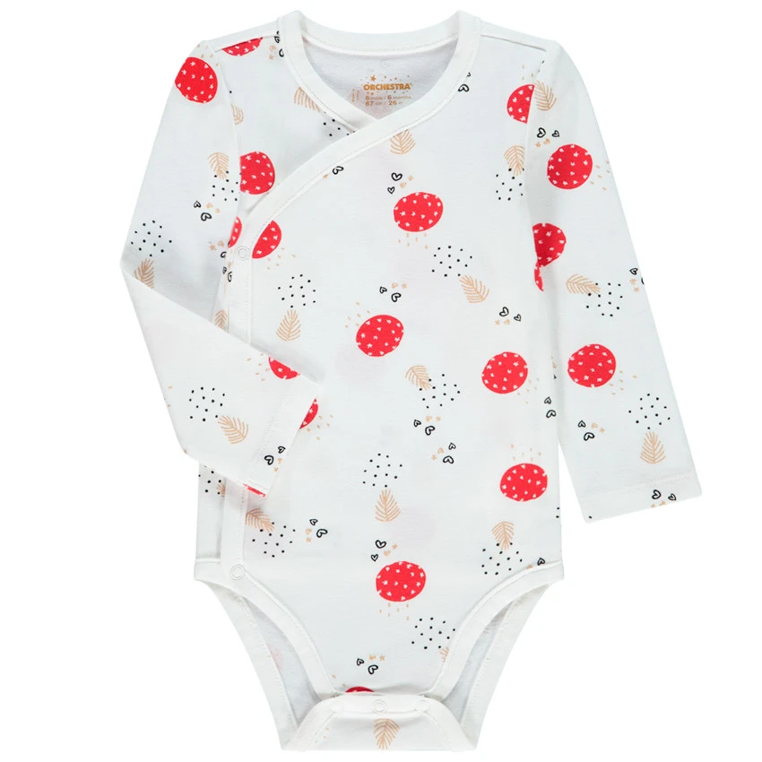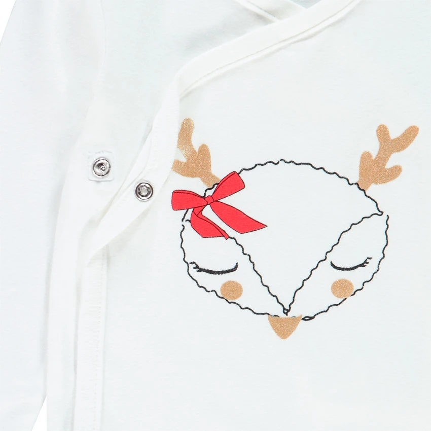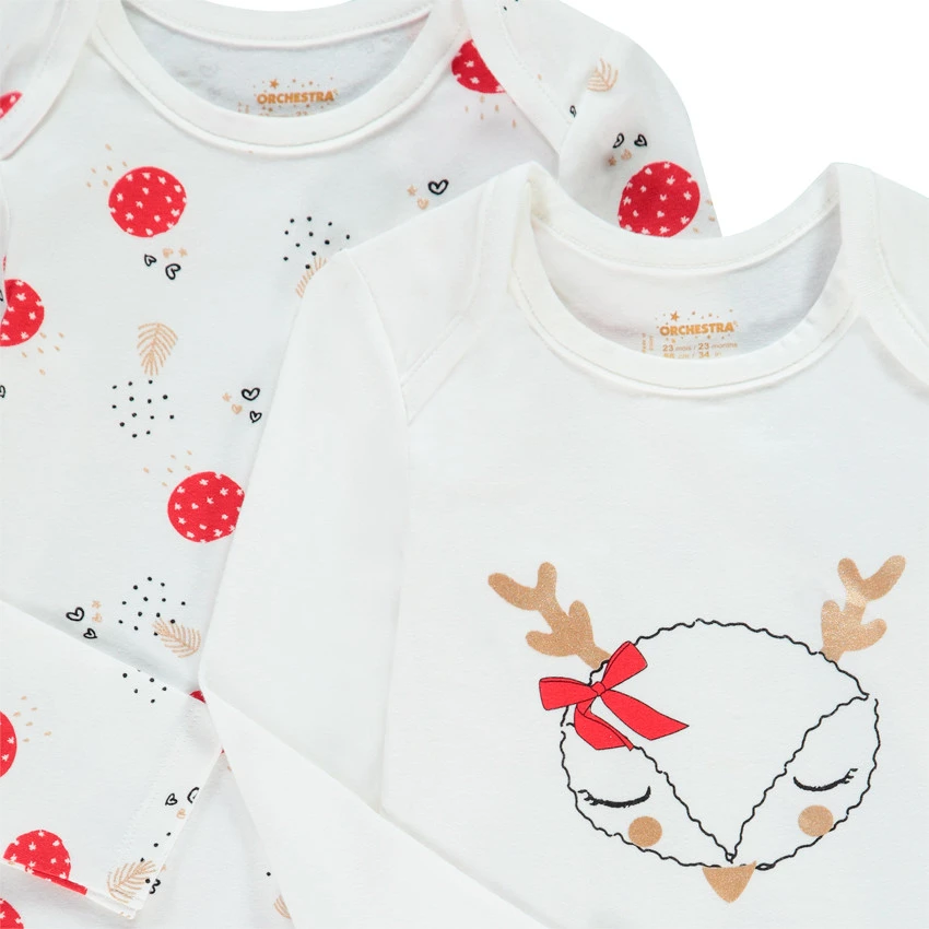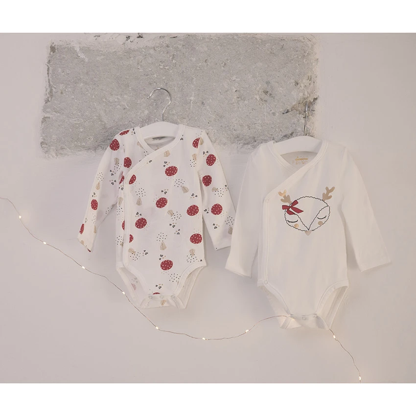Lot de 2 bodies manches longues en coton pour bébé fille. Imprimés esprit Noël avec touches de doré. Ouverture pressionnée croisée devant du 1 au 6 mois. Emmanchures US du 9 au 36 mois. Entrejambe pressionné.