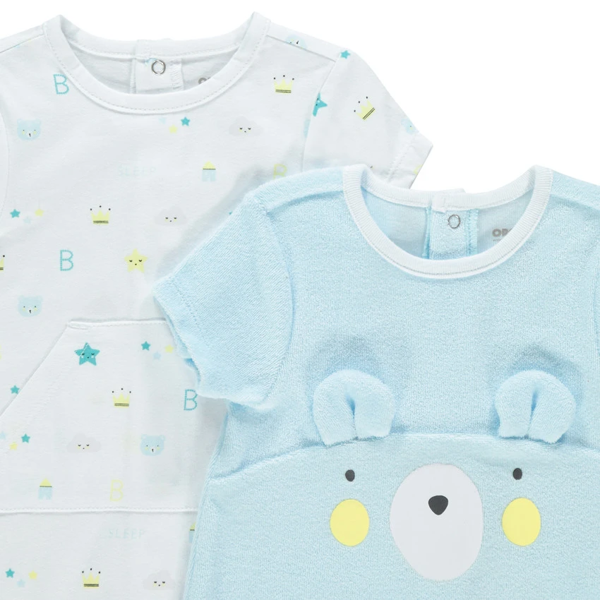Lot de 2 combinaisons courtes. Encolure ronde. Entrejambe et dos pressionné.