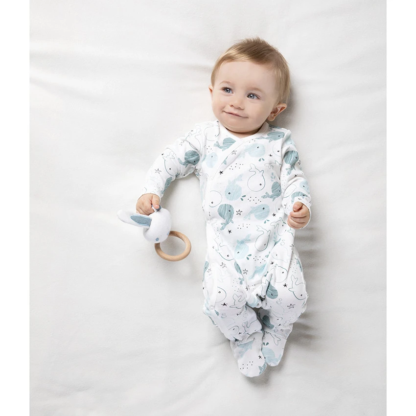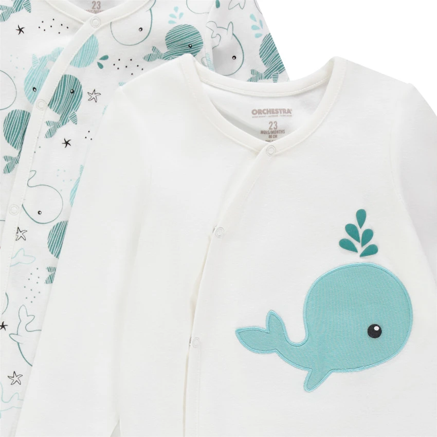 Lot de 2 dors-bien en jersey. 100% coton. Ouverture pressionnée devant et à l’entrejambe pour faciliter l’habillement et le change de bébé.