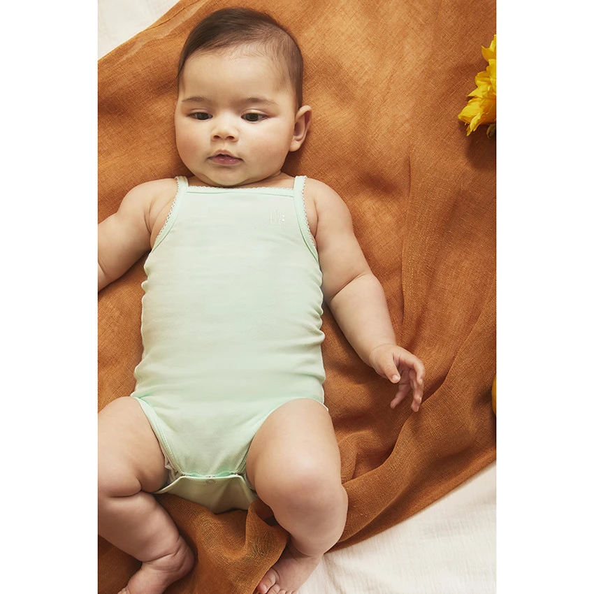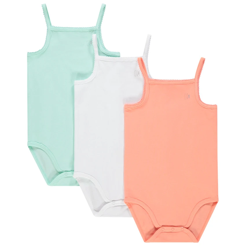 Lot de 3 bodies en jersey. Coloris unis. Fines bretelles finition festonnée. Printé glitter du logo côté cœur. Entrejambe pressionné pour faciliter le change.