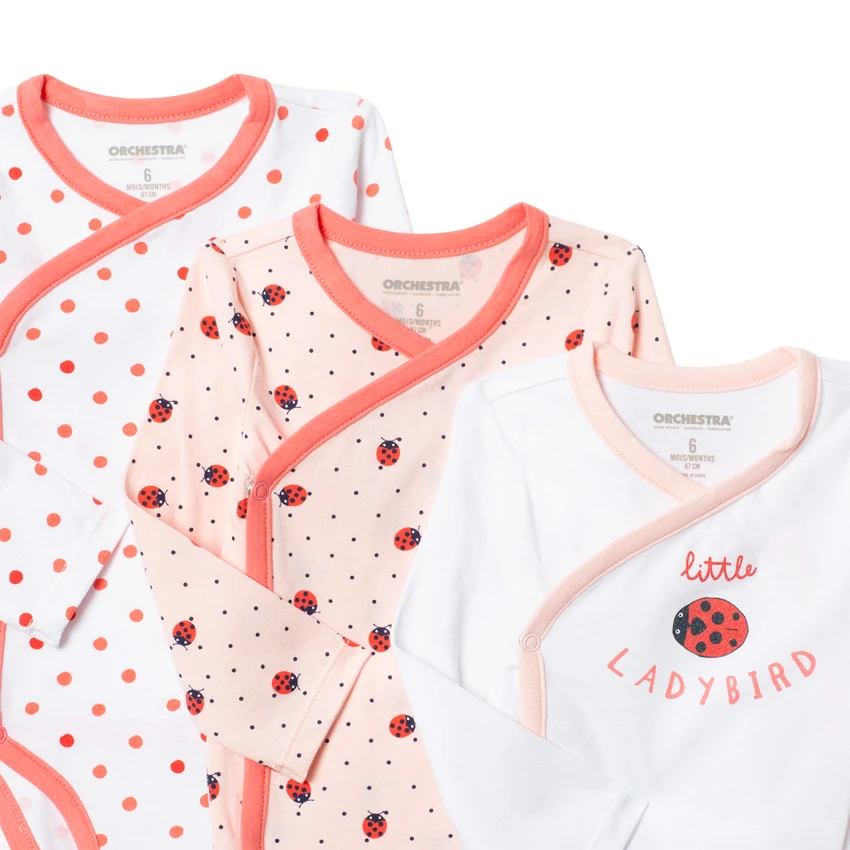 Lot de 3 bodies manches longues en coton. Ouverture pressionnée croisée devant du 1 au 6 mois. Emmanchures US du 9 au 36 mois.