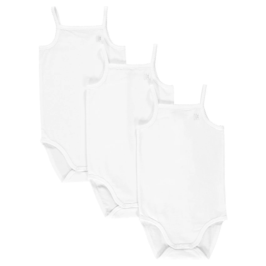 Lot de 3 bodies à bretelles, en jersey de coton stretch. Coloris uni différent selon le modèle. Encolure carrée, bretelles et emmanchures finition dentelée. Inscription « Orc » argentée printée en haut à gauche. Ouverture pressionnée à l’entrejambe. Bords finition biais.