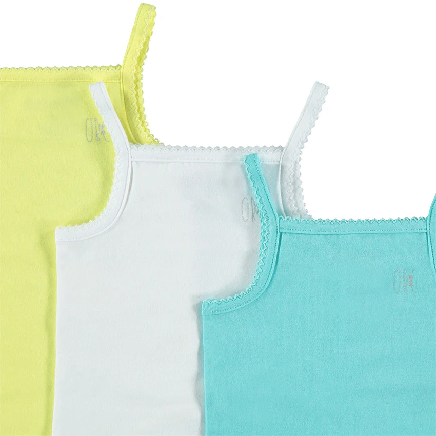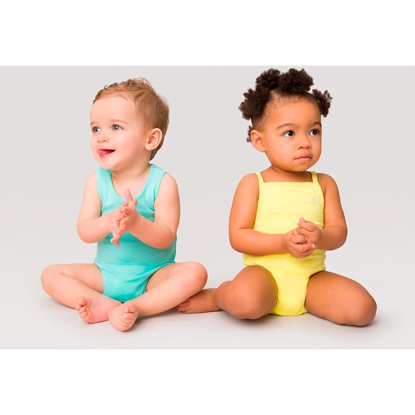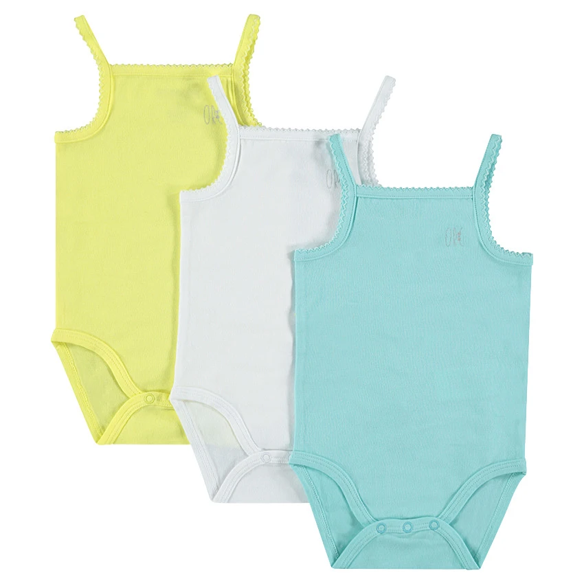Lot de 3 bodies sans manches en coton. Bretelles fines. Logo printé sur la poitrine. Entrejambe pressionné. Couleurs unies.