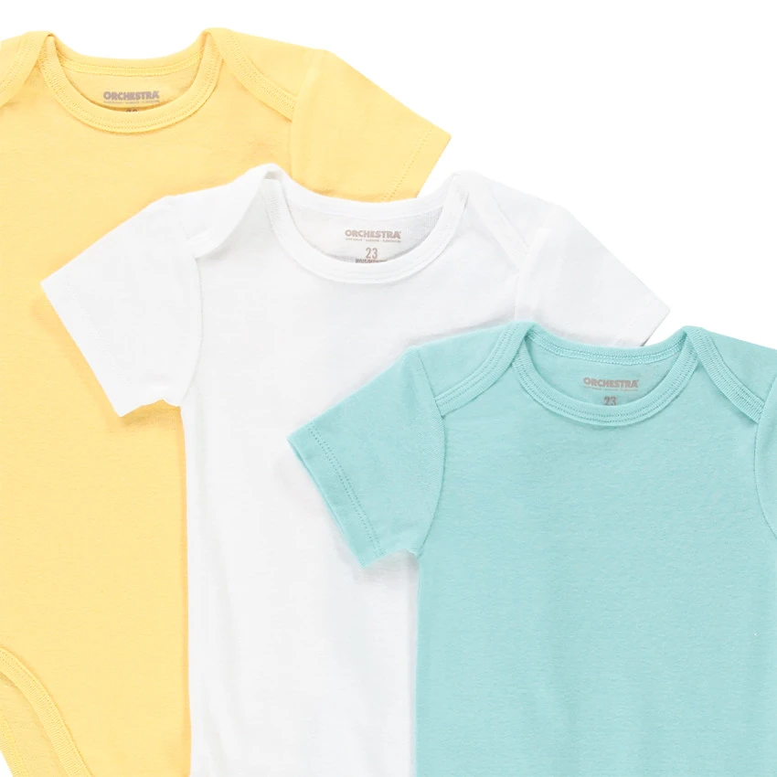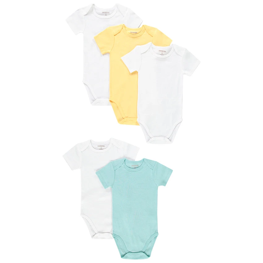Lot de 5 bodies manches courtes unis. Encolure ronde. Entrejambe pressionnée. Coloris différents selon le modèle.