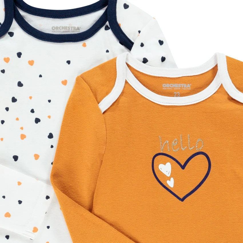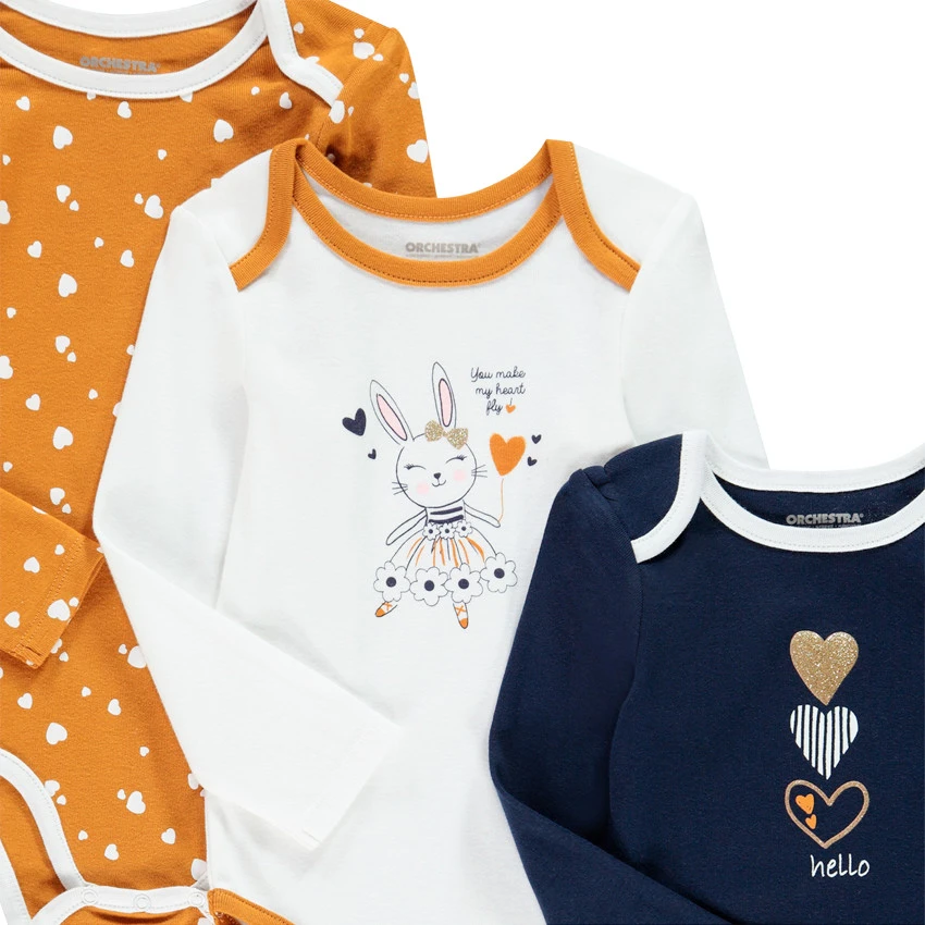 Lot de 5 bodies manches longues en coton. Emmanchures US du 9 au 36 mois. Entrejambe pressionné.