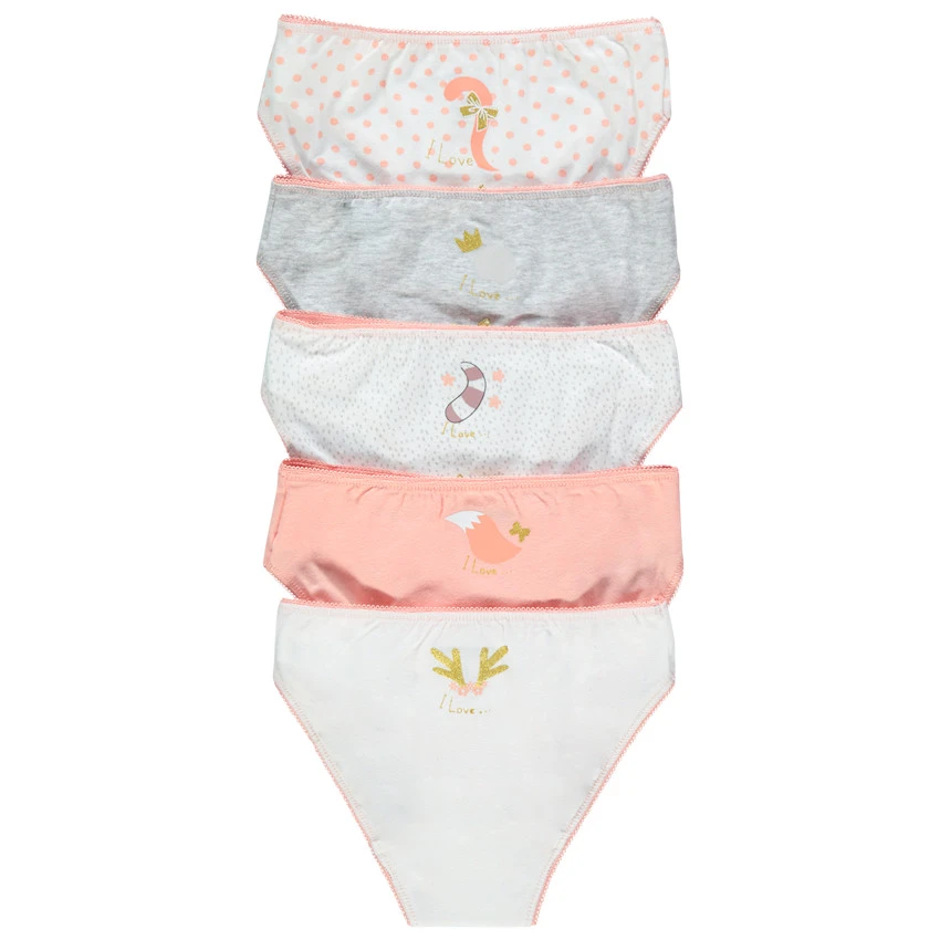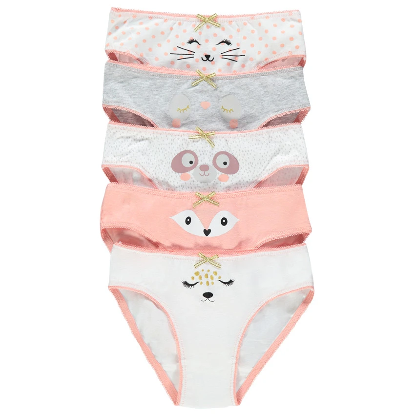 Lot de 5 culotte en coton. Taille élastiquée avec petit noeud doré. Animaux printés devant. Coloris différents selon le modèle.