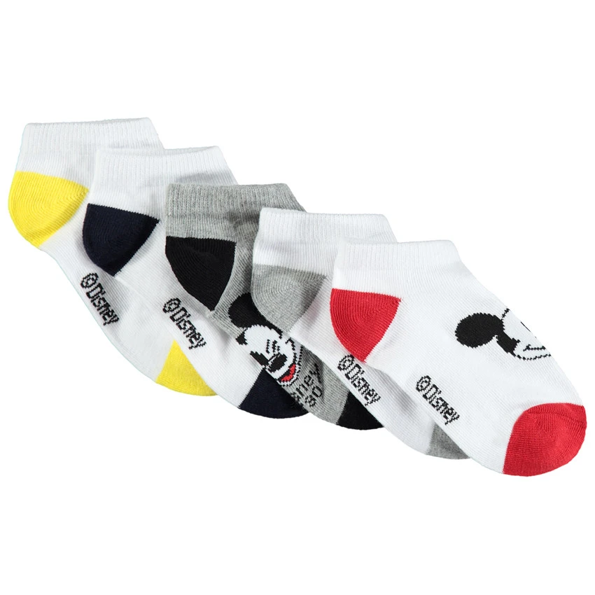 Lot de 5 paires de chaussettes courtes. Col en bord-cÎte. Bout et talon contrastés. Marque sous le pied. Mickey en jacquard.