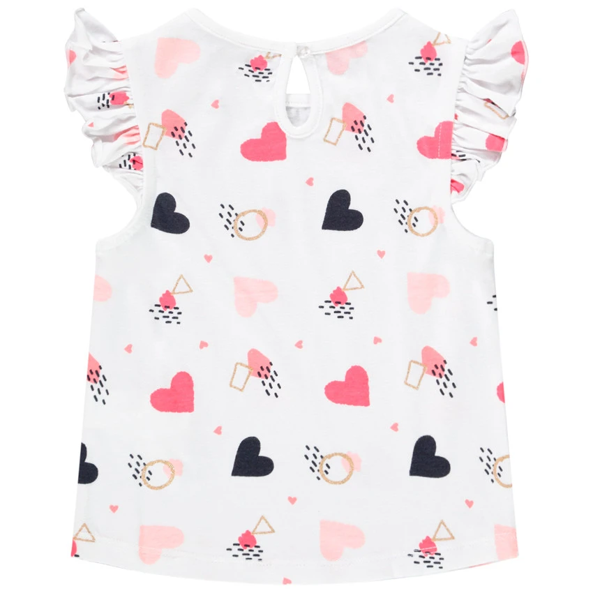 Lot de 5 t-shirts. Encolure ronde. Manches courtes volantées. Ouverture boutonnée au dos. Deux modèles unis. Deux modèles imprimés all-over. Un modèle uni avec print sur le devant.