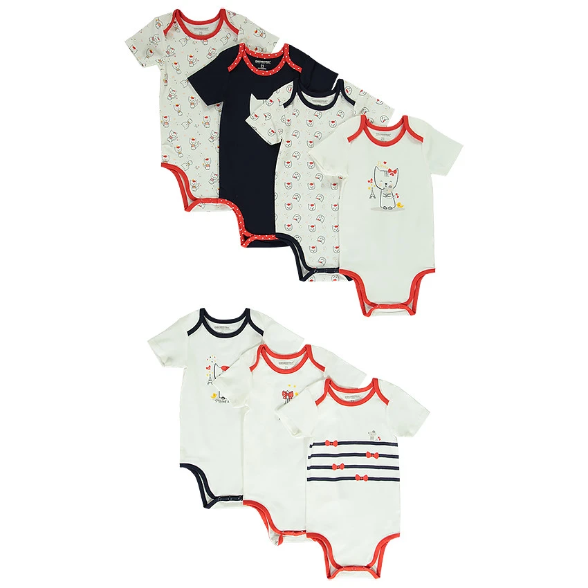 Lot de 7 bodies. Encolure ronde contrastée. Manches courtes. Ouverture pressionnée sur le devant OU à l’entrejambe selon l’âge. Liseré de finition contrasté. Coloris et imprimés différents selon le modèle.