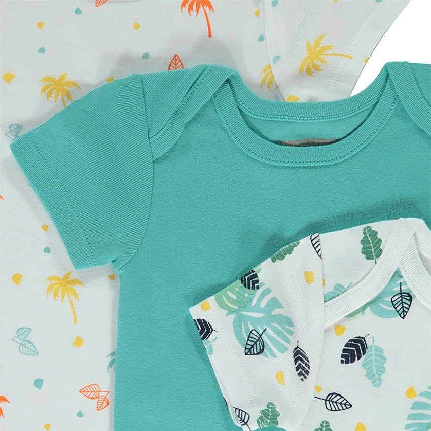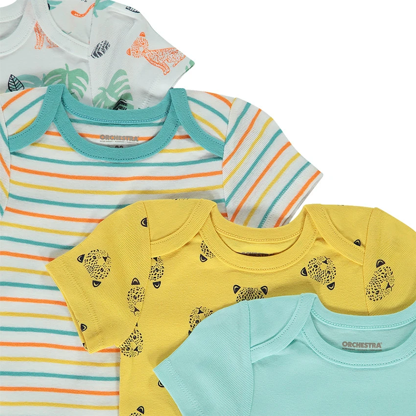 Lot de 8 bodies manches courtes en coton. Ouverture pressionnée à l’entrejambe. Col rond.