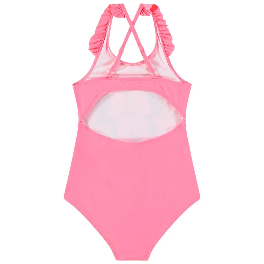 Maillot de bain 1 pièce rose. Print Minnie Disney. Col rond. Bretelles volantées. Bretelles croisées au dos. Ouverture au dos.