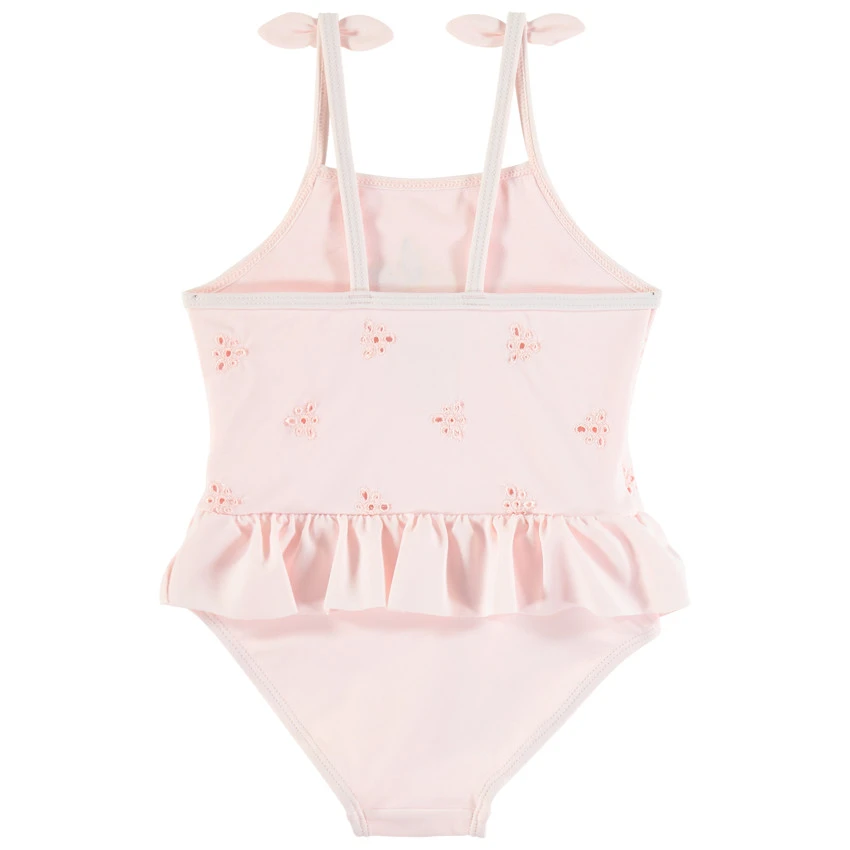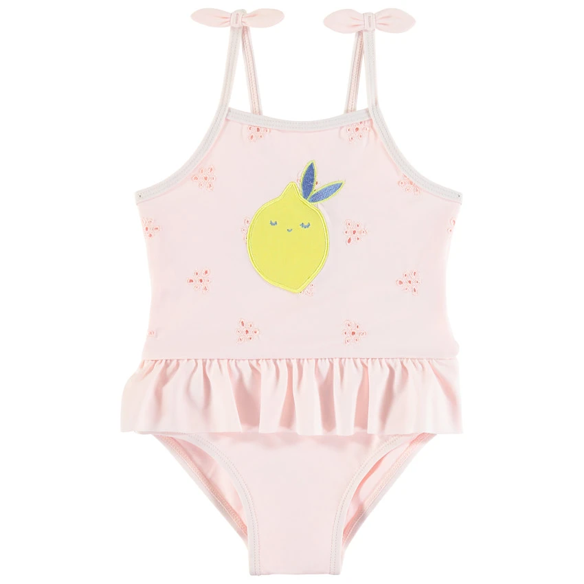 Maillot de bain 1 pièce. Détails en broderie anglaise. Bretelles fines à nouettes fantaisie. Citron brodé devant. Volant à la taille.