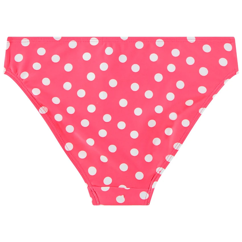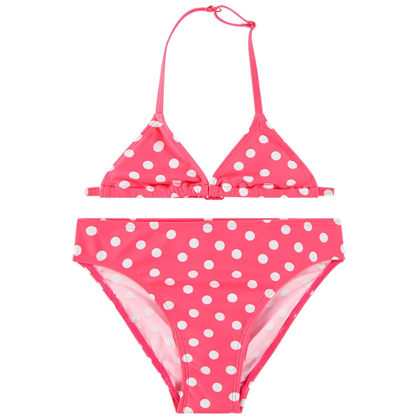 Maillot de bain 2 pièces rose. Motifs pois. Haut de maillot forme triangle. Bas de maillot forme culotte. Liens ajustables autour de la nuque.