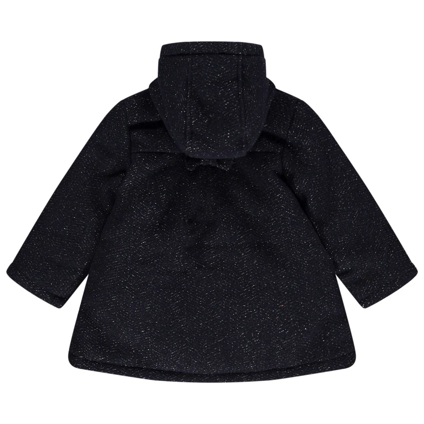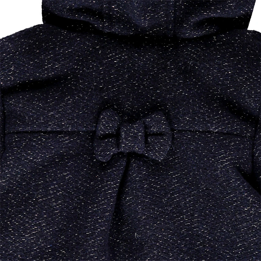 Manteau à capuche en drap de laine. Maille mélangée. Doublure en sherpa. Ouverture devant par zip et pressions. 2 poches passepoilées avec noeuds cousus. Noeud cousu au dos.