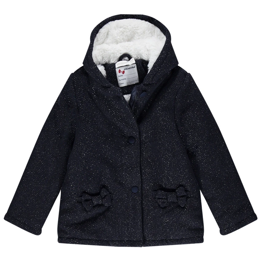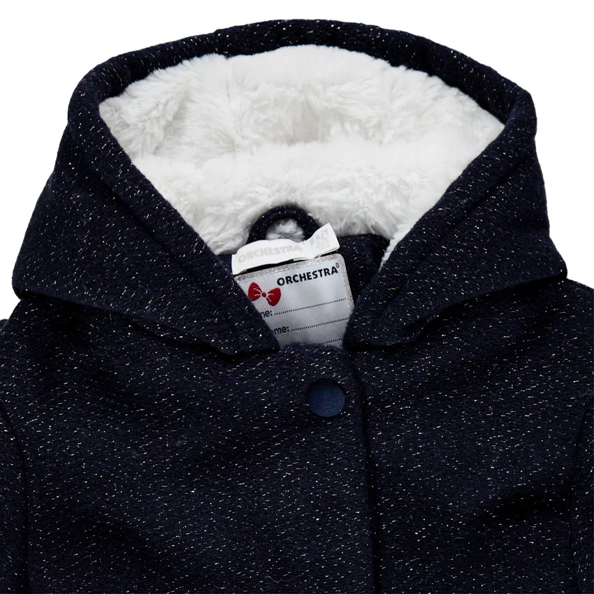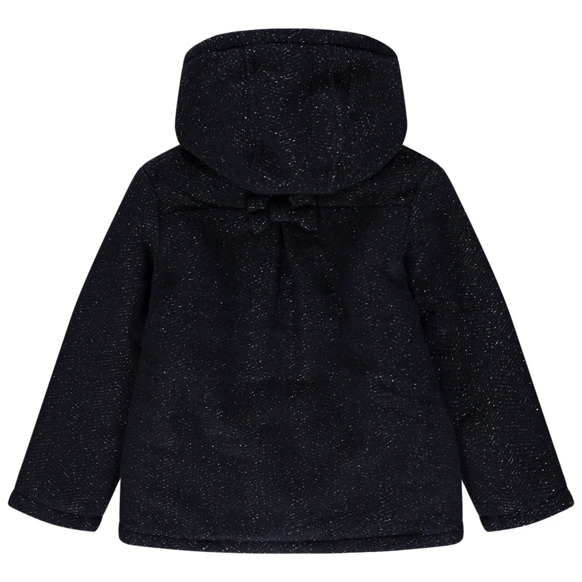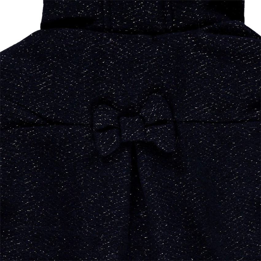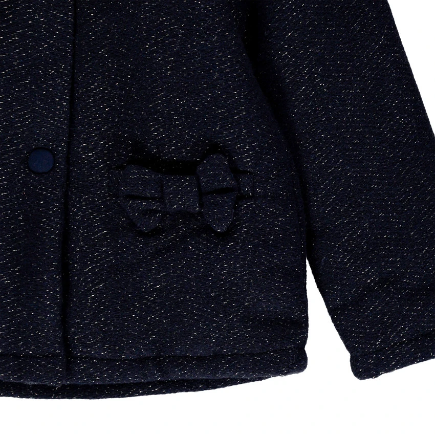 Manteau en drap de laine. Maille mélangée. Doublure en sherpa. Ouverture zippée sous patte pressionnée. 2 poches avec noeuds cousus. Noeud cousu en haut du dos.