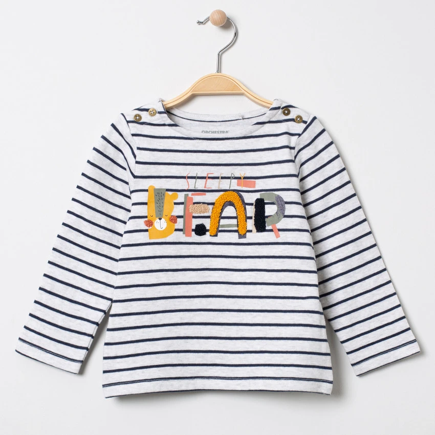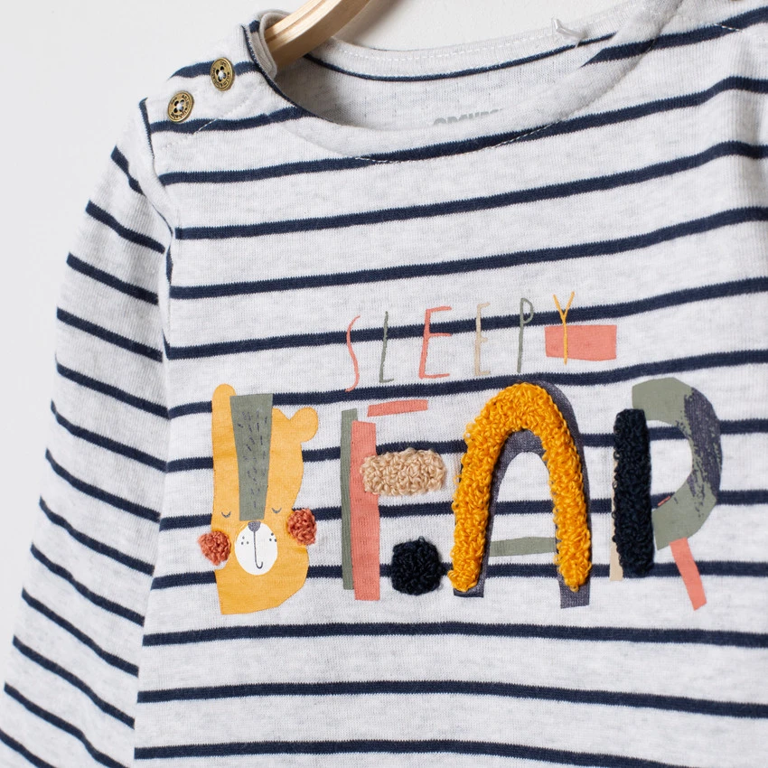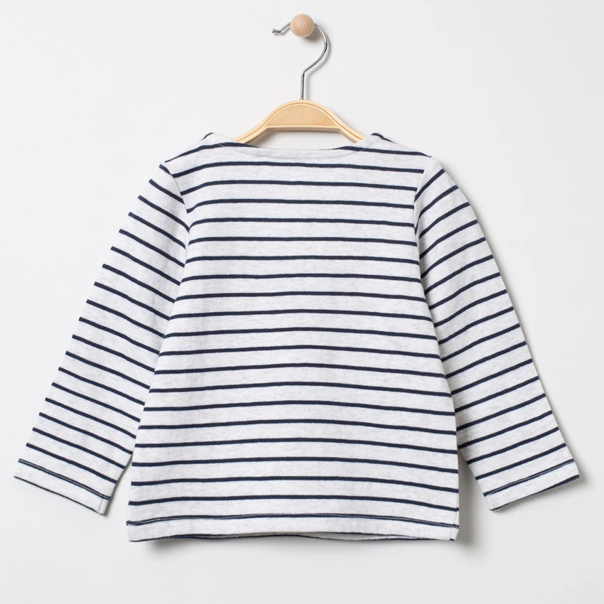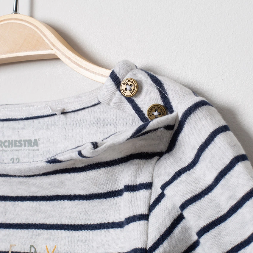 Marinière rayée all-over. Inscription en bouclette sur le devant. Ouvertures boutonnées sur le côté du col.