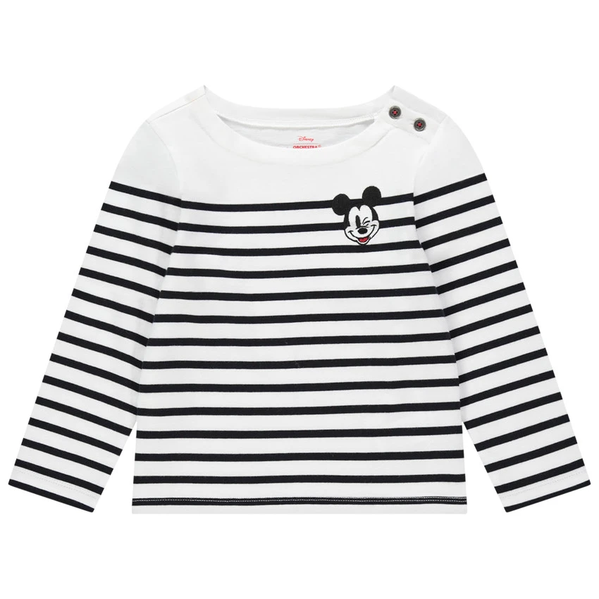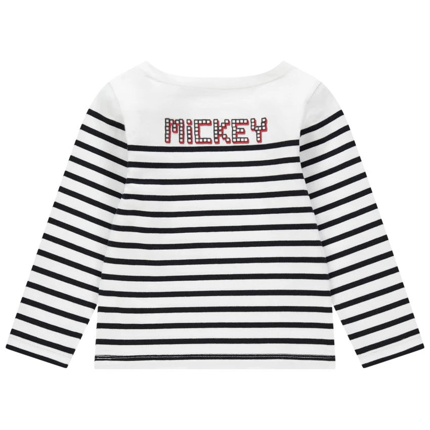 Marinière en coton. Rayures placées. Encolure ronde en bord-côte avec ouverture boutonnée. Mickey brodé sur la poitrine.