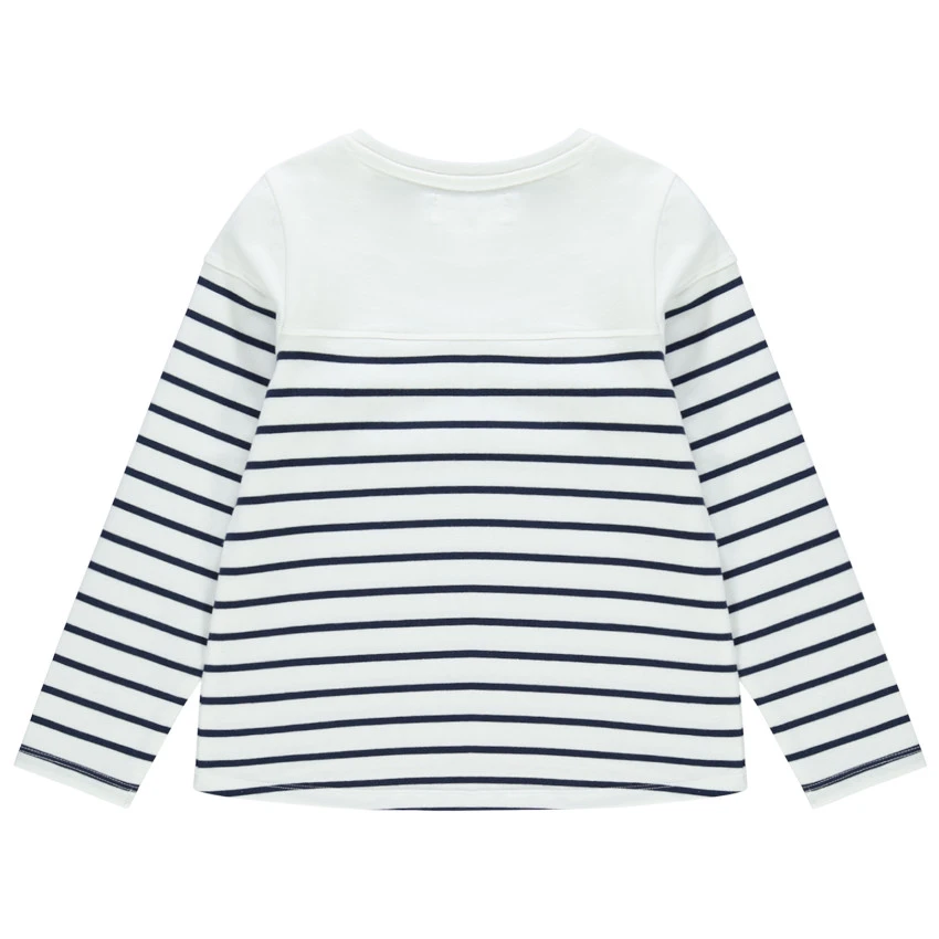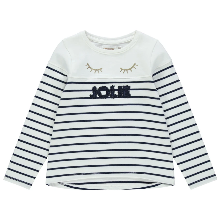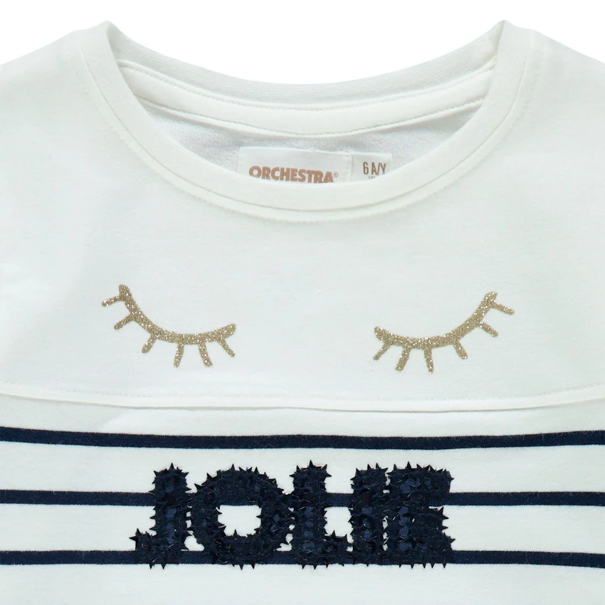 Marinière en coton. Encolure ronde en bord-côte. Yeux pailletés. Inscription printée devant.