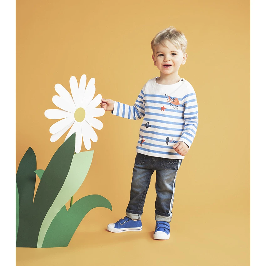Marinière en jersey. Coton issu de l’agriculture biologique. Encolure ronde en bord-côte à ouverture pressionnée. Motifs fantaisie printés devant.