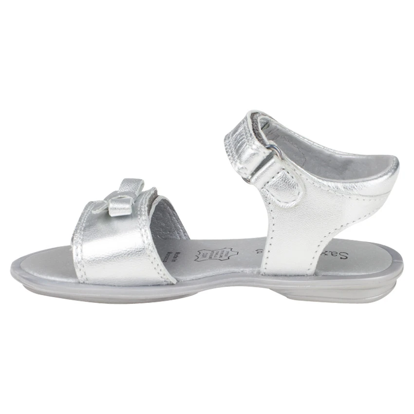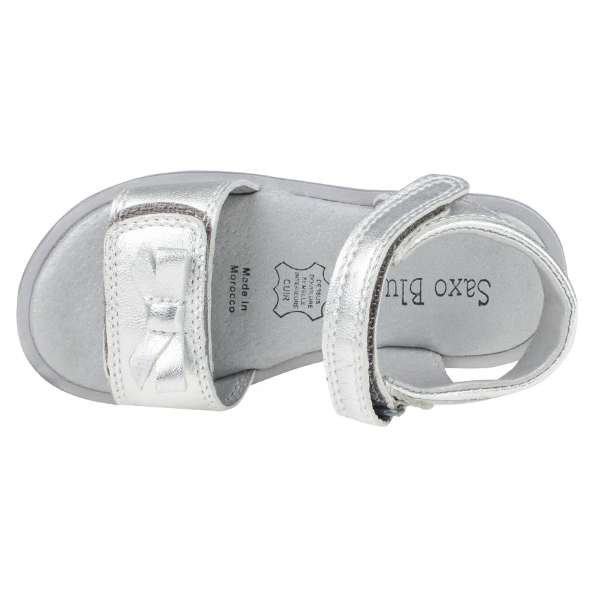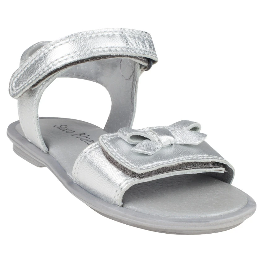 Nu-pieds en cuir. Coloris argenté uni. Bride à patte auto-agrippante à la cheville. Bourrelet de renfort à l’arrière. Large patte auto-agrippante devant avec noeud plaqué dessus. Semelle intérieure en cuir. Semelle extérieure en caoutchouc.