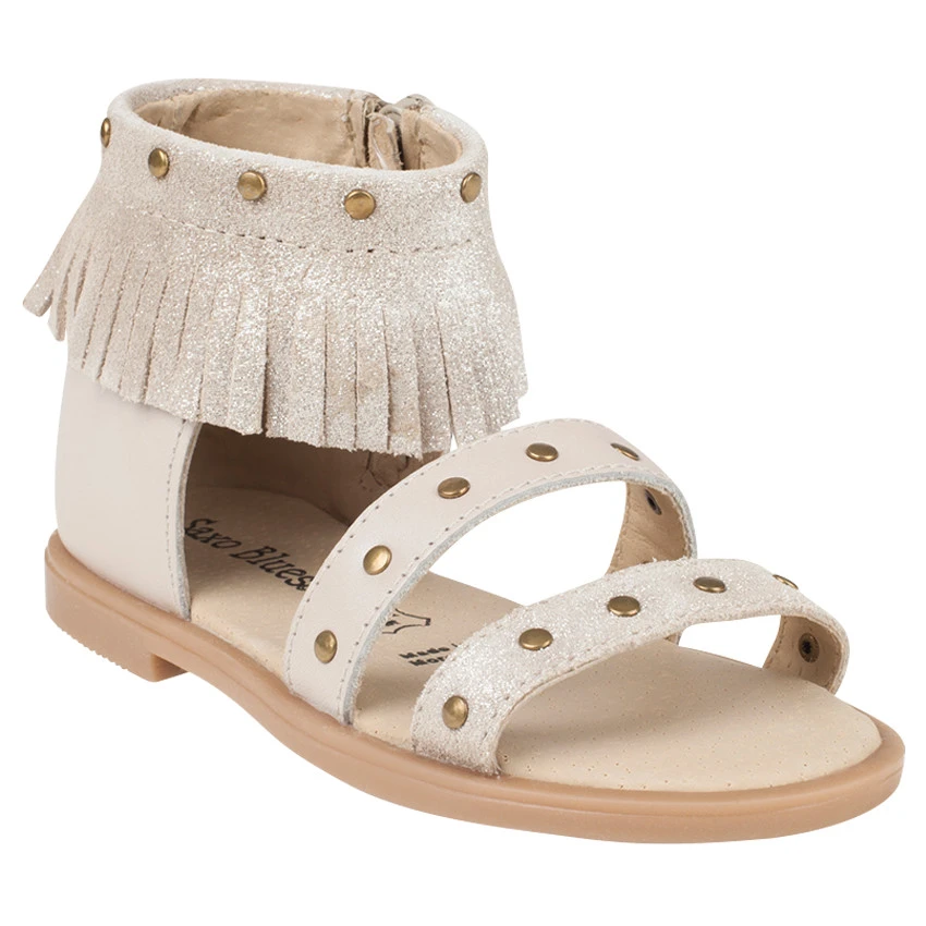 Nu-pieds en cuir. Coloris beige pailleté. Empiècement plein à l’arrière du pied. Ouverture par zip sur le côté. Col à franges. Lanières sur le dessus du pied. Rivets fantaisie dorés. Semelle intérieure en cuir. Semelle extérieure en caoutchouc.