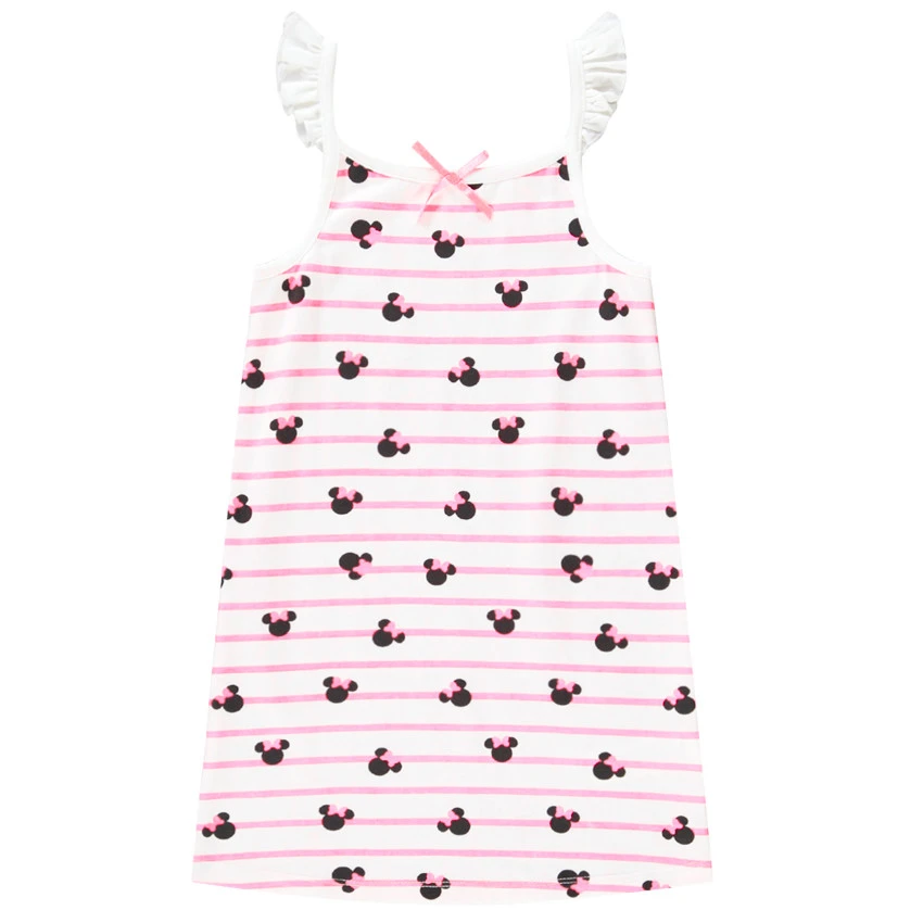 Nuisette Minnie. Encolure ronde. Bretelles fines volantées. Noeud fantaisie sur l’encolure. Imprimé Minnie et rayures all-over.