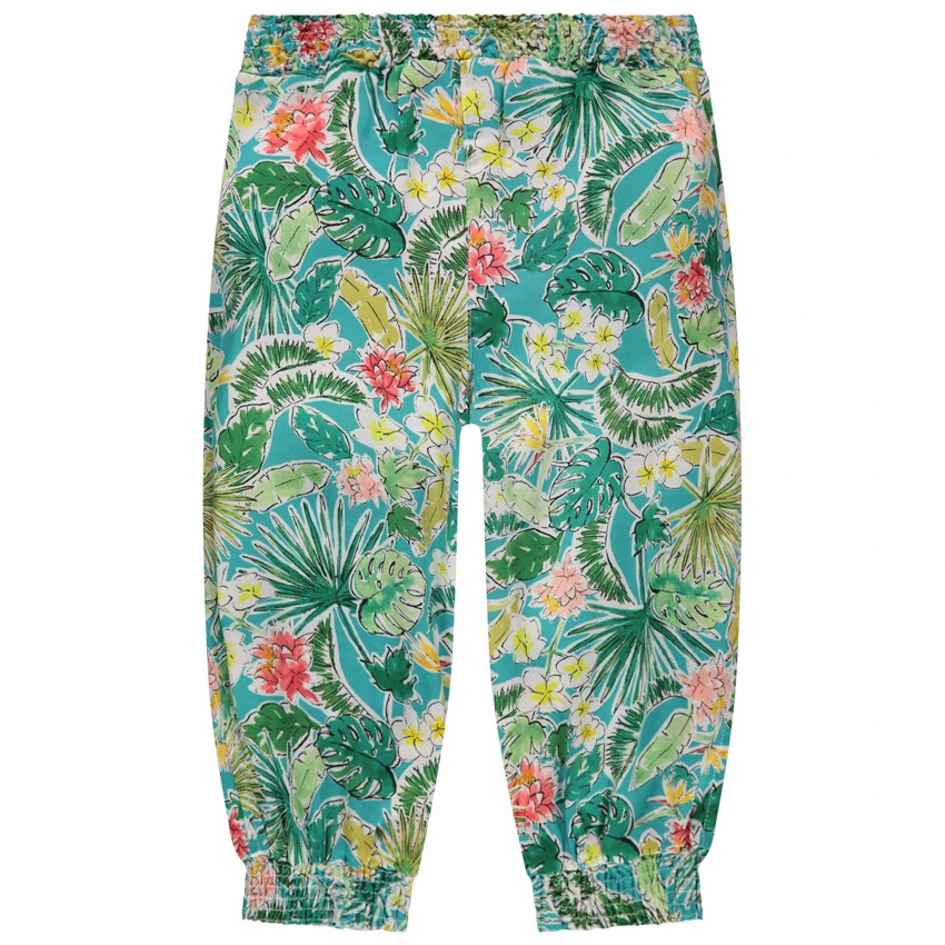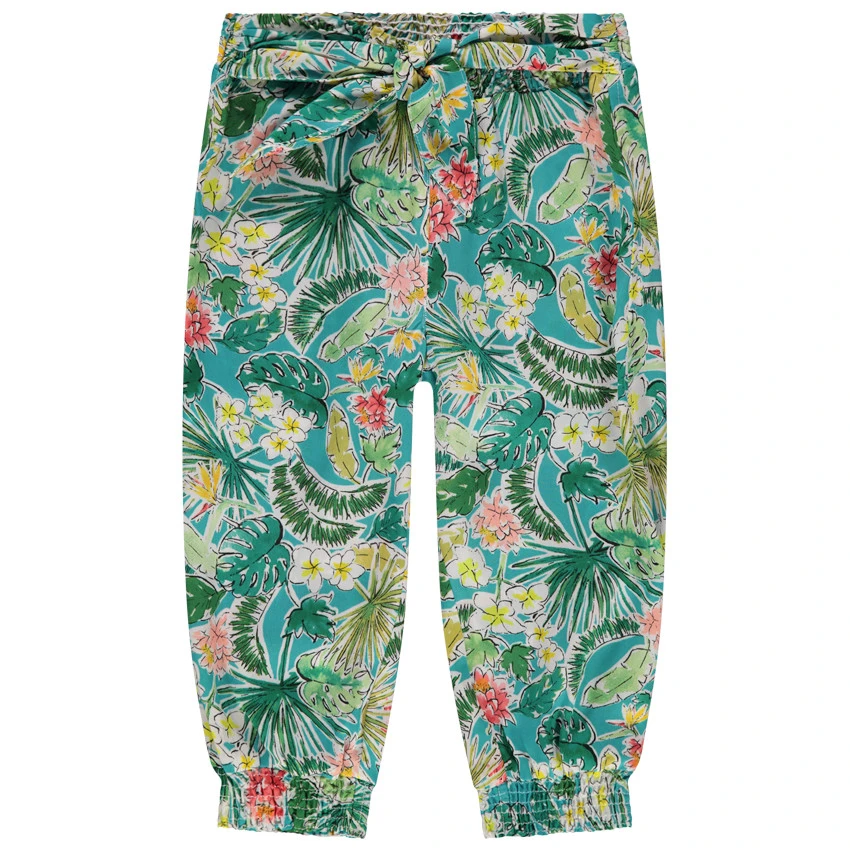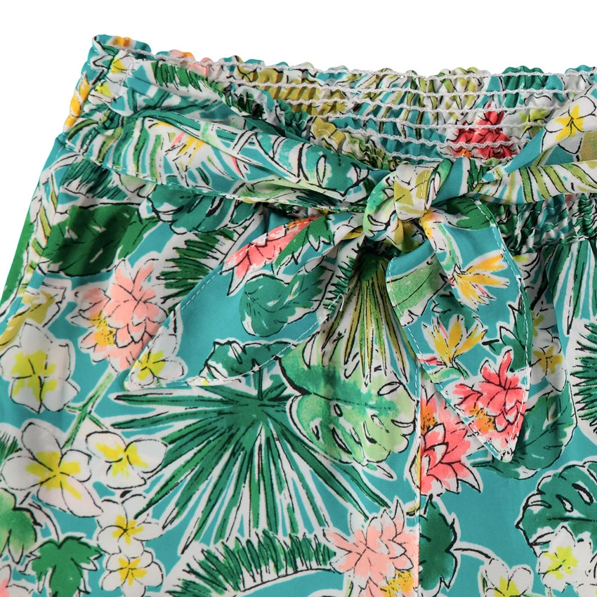 Pantacourt fluide à imprimé végétal all-over. Taille élastiquée avec ceinture à nouer. Chevilles élastiquées.