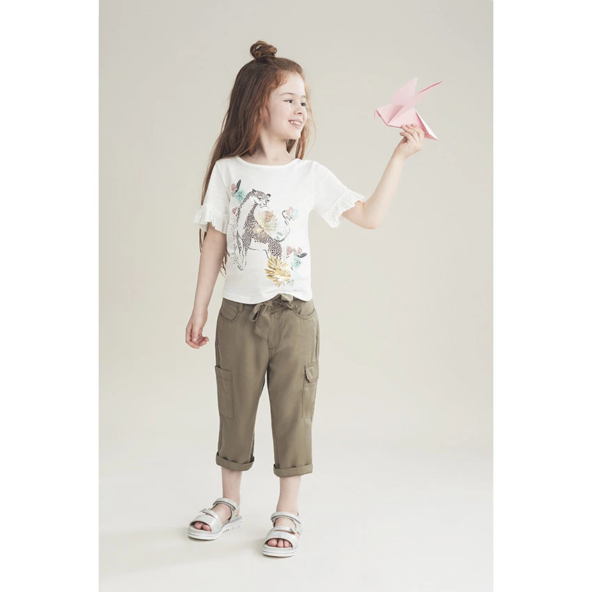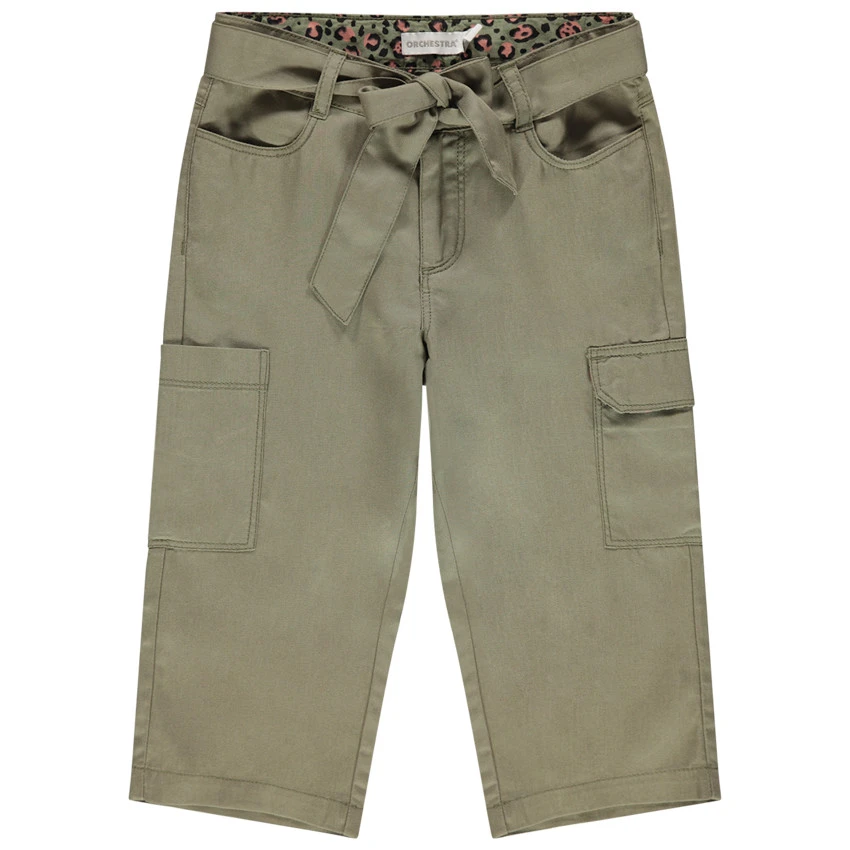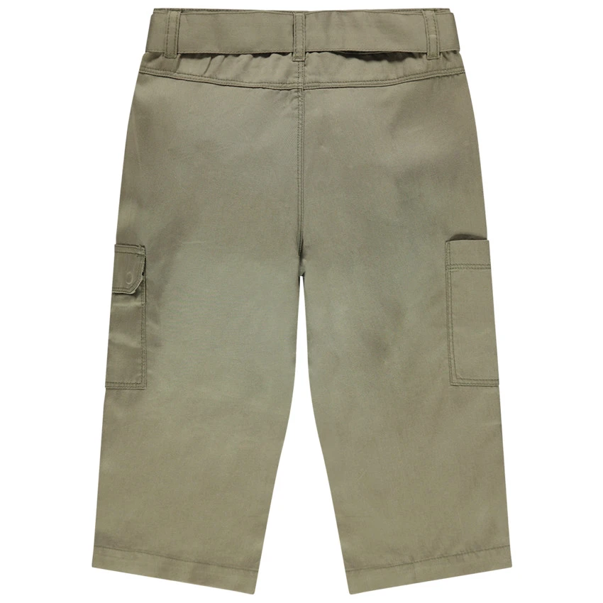 Pantacourt kaki en lyocel. Taille ajustable de l’intérieur par élastique et boutons. Ceinture à passants avec bouton et braguette zippée. 2 poches cavalières. Ceinture à nouer. 2 poches à rabat sur les jambes.