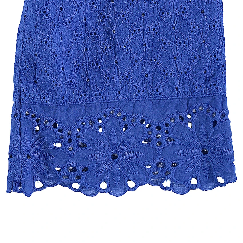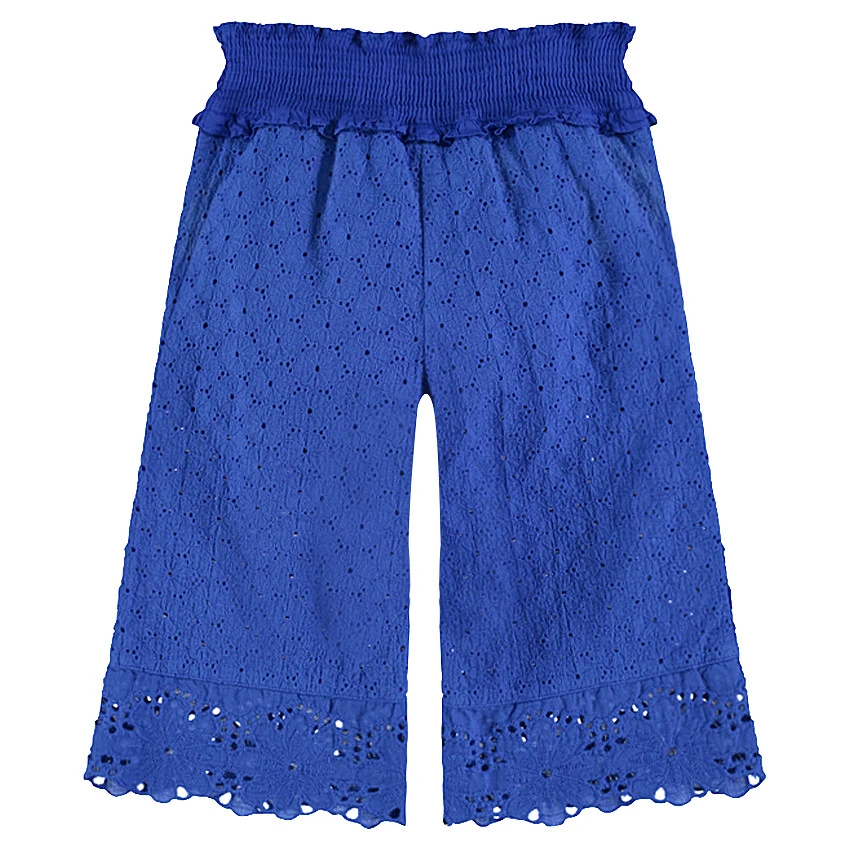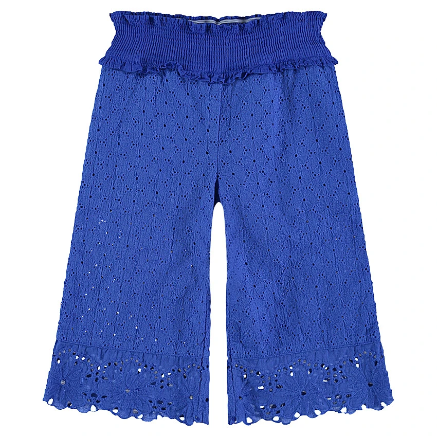 Pantacourt large en broderie anglaise. Coloris bleu électrique uni. Taille élastiquée smockée. Doublure en voile de coton forme short.