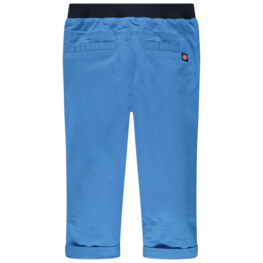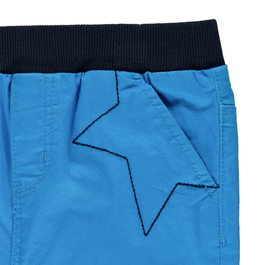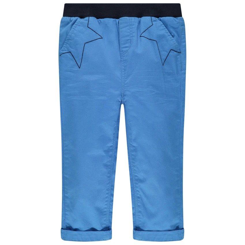Pantalon bleu effet crinkle. Taille élastiquée en bord-côte. Découpe braguette. 2 poches italiennes avec étoiles brodées. 2 poches passepoilées au dos.