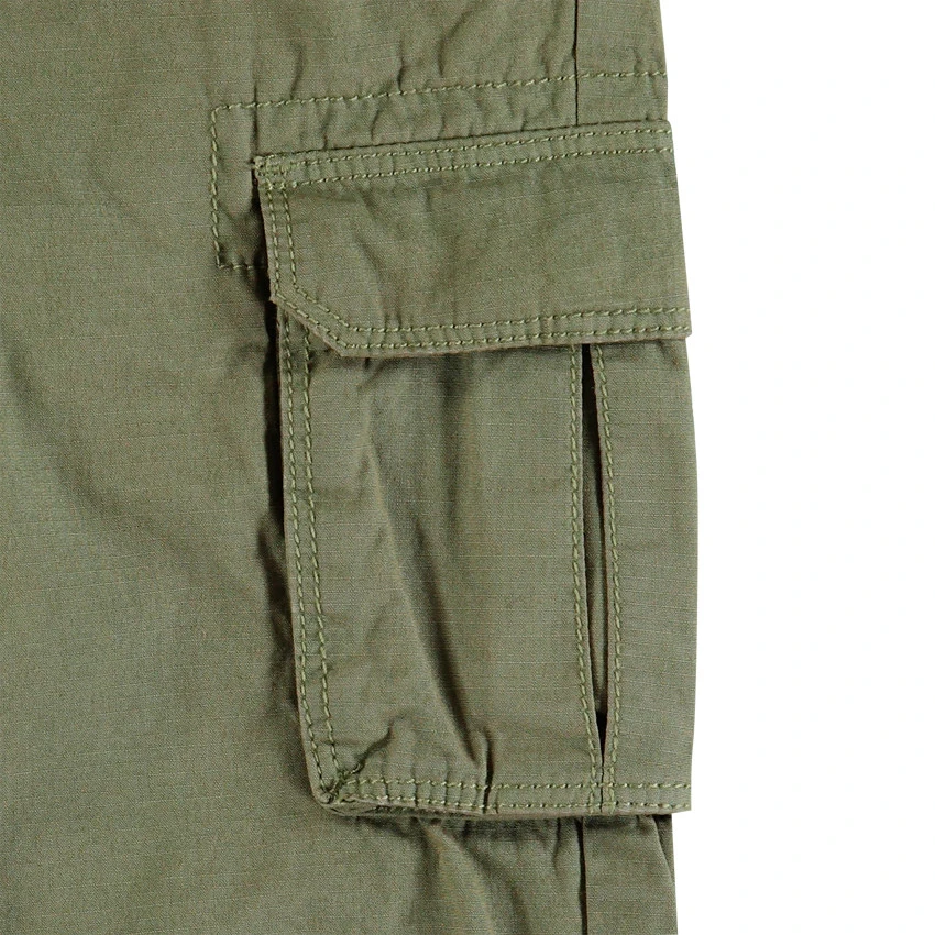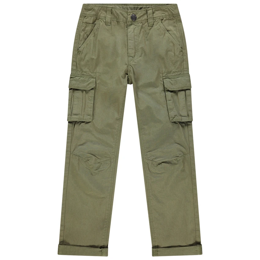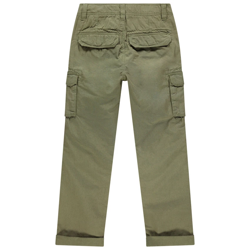 Pantalon en toile style cargo. Taille à passants ajustable de l’intérieur. Ouverture par braguette et bouton. 2 poches italiennes. 2 poches à rabat sur les jambes. Découpes sur les genoux. 2 poches à rabat au dos.