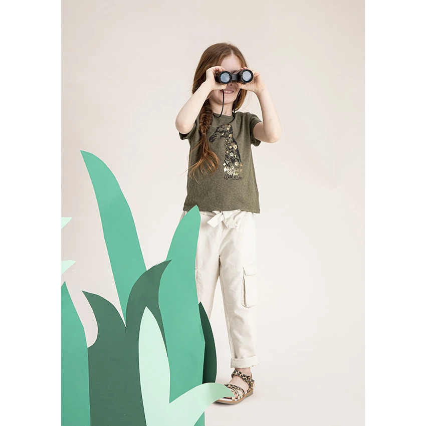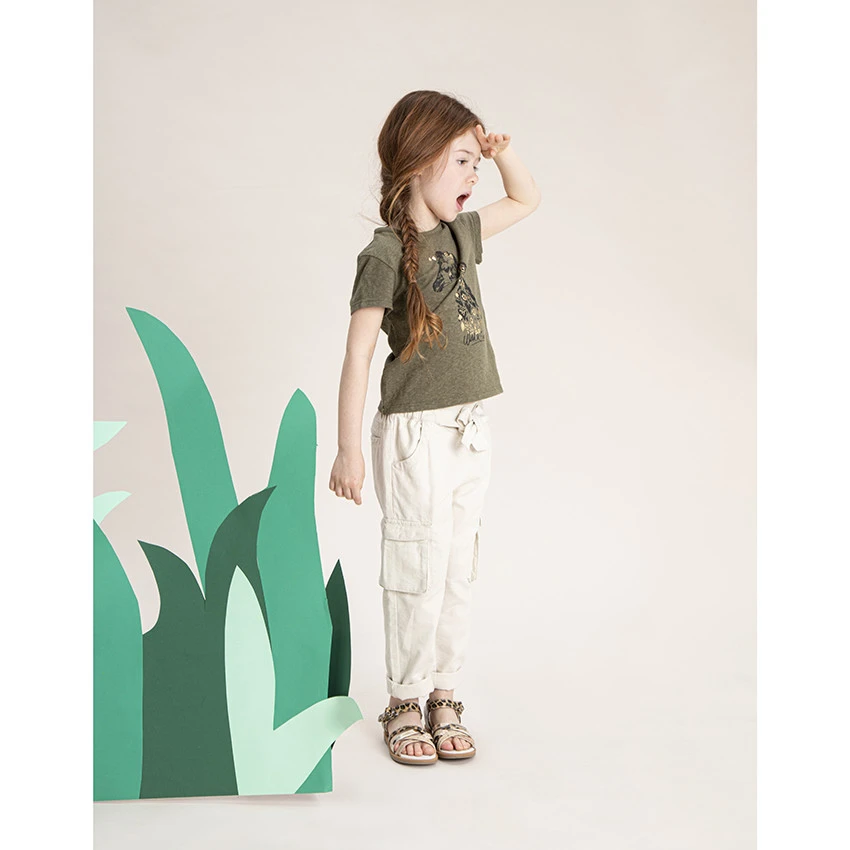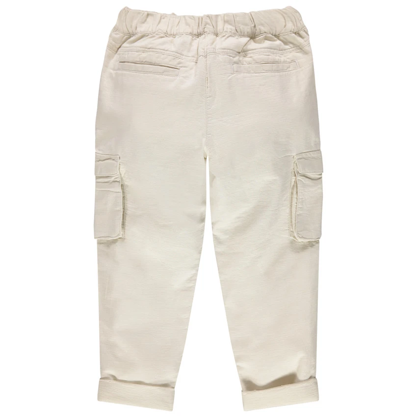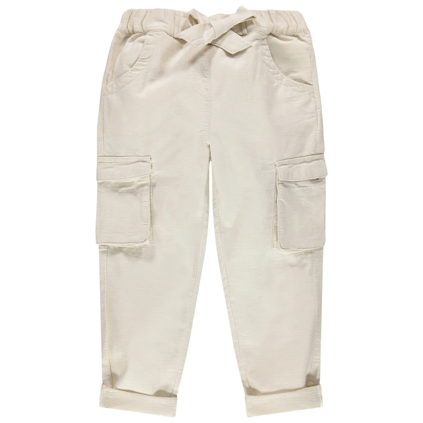 Pantalon cargo en twill. Liens à nouer sur le devant. 2 poches cavalières. 2 poches à rabat sur les côtés. 2 poches plaquées au dos.