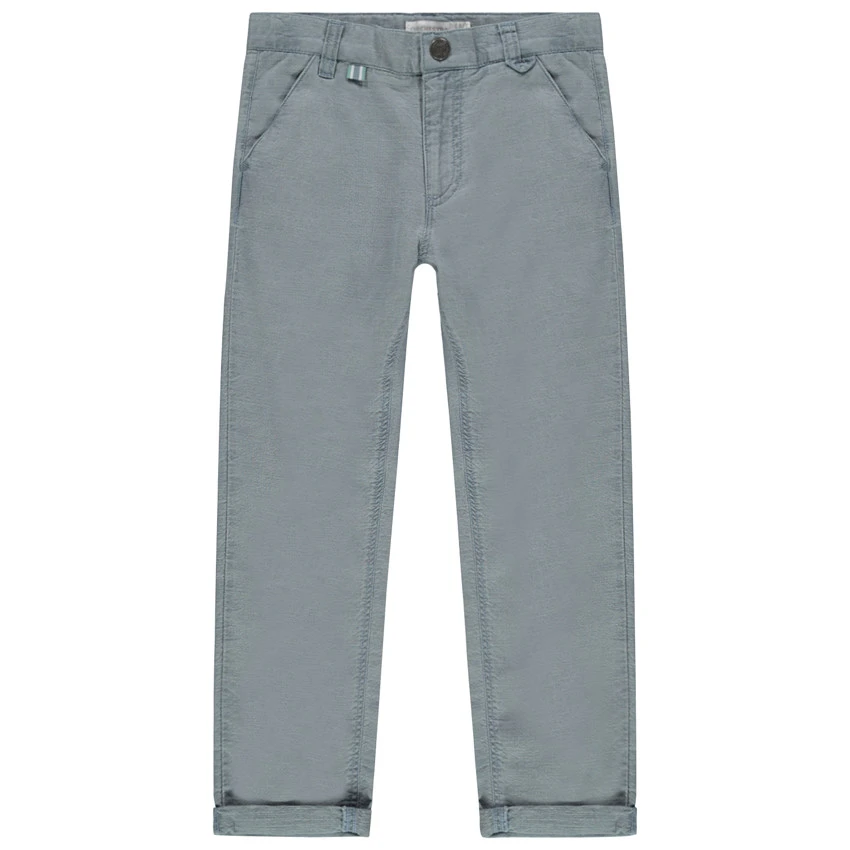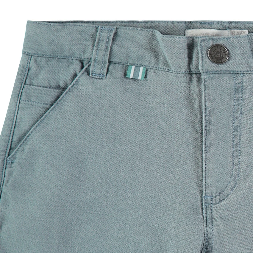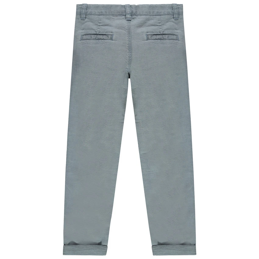 Pantalon chino effet surteint. Taille ajustable de l’intérieur par élastique et boutons. Ceinture à passants avec bouton et braguette zippée. 2 poches italiennes. 2 poches passepoilées au dos.