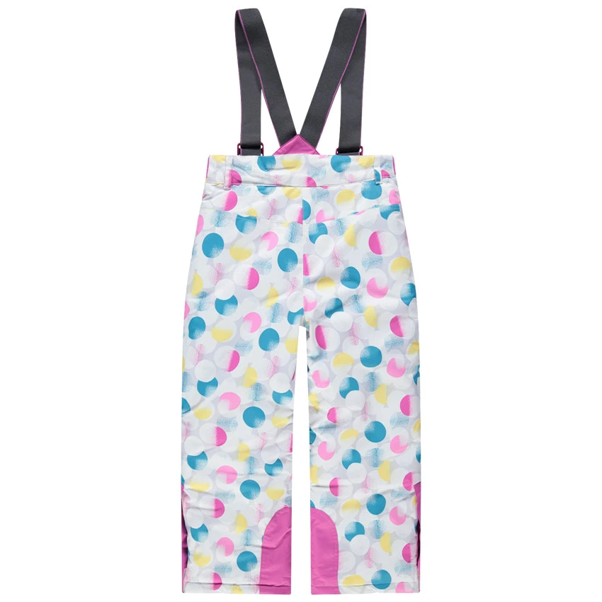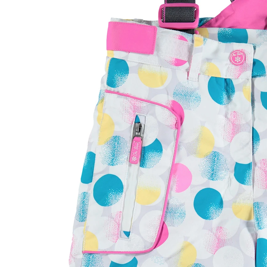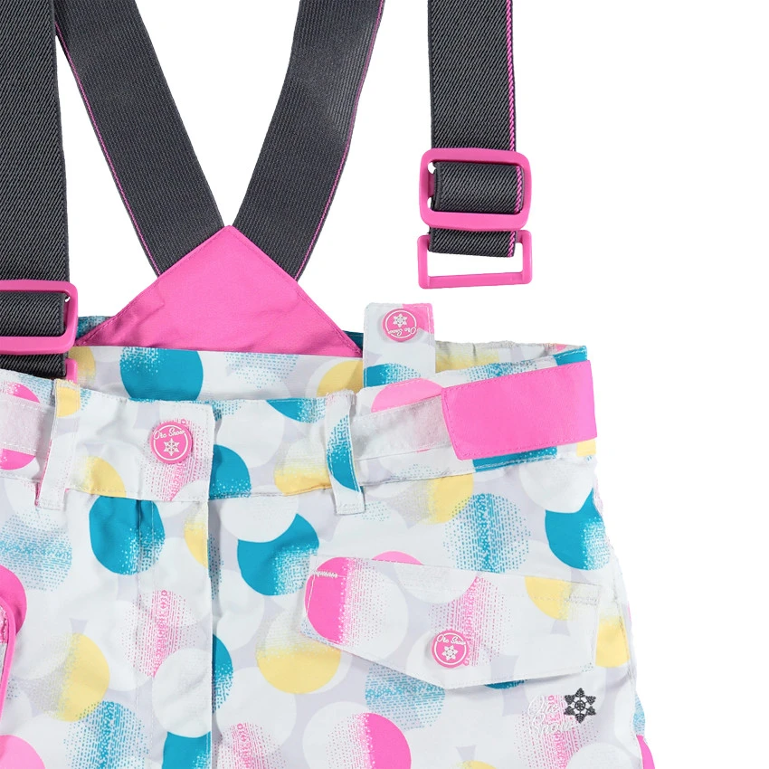 Pantalon de ski à pois all-over. Bretelles ajustables amovibles. 1 poche zippée et 1 poche à rabat. Taille ajustable par scratchs. Bas du pantalon zippé avec soufflet pare-neige pressionné.