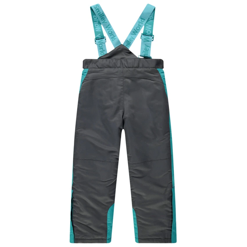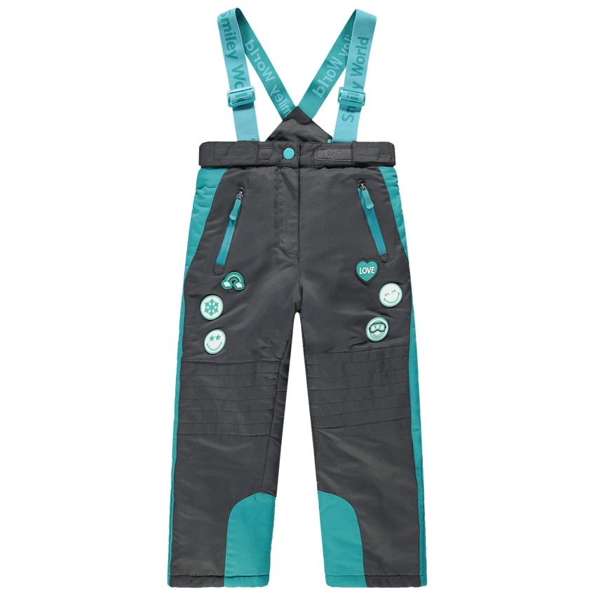 Pantalon de ski imperméable pour fille. Taille ajustable avec lanière à scratch. 2 poches zippées sur le devant. Bretelles amovibles. Badges SmileyWorld. Soufflet pare-neige imprimé SmileyWorld sur le bas des jambes.