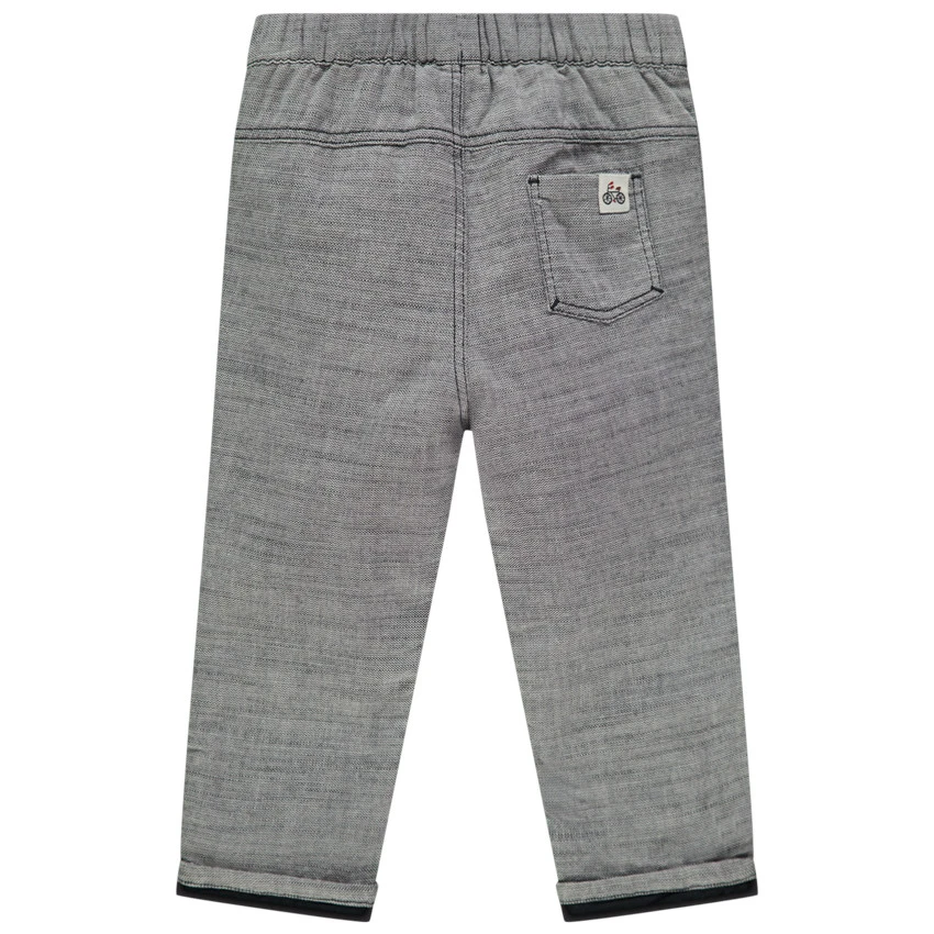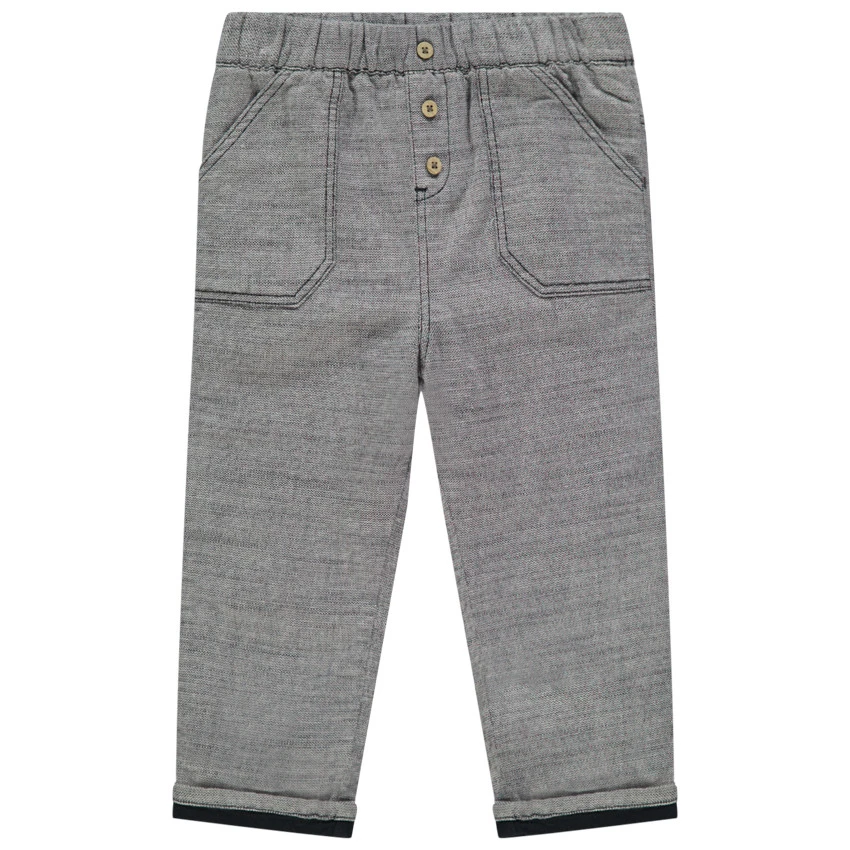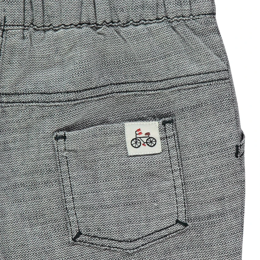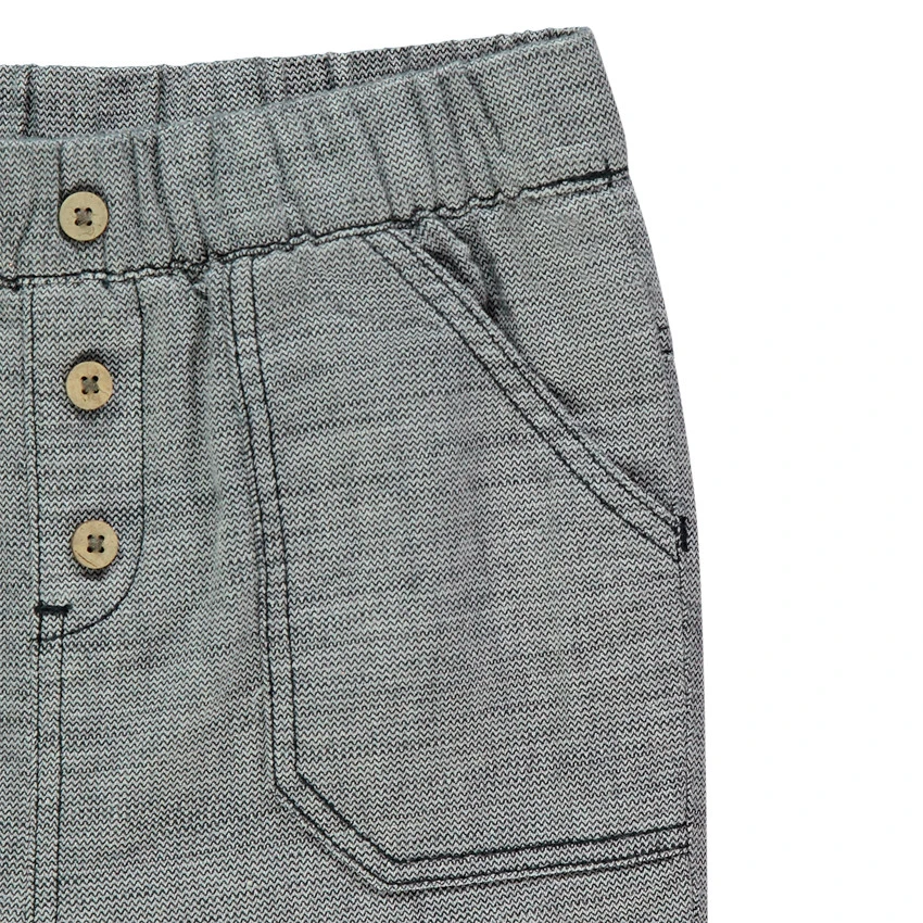 Pantalon en maille chinée doublé jersey. Taille élastiquée. Boutons fantaisie devant. 2 poches italiennes devant. 1 poche plaquée au dos avec étiquette fantaisie.