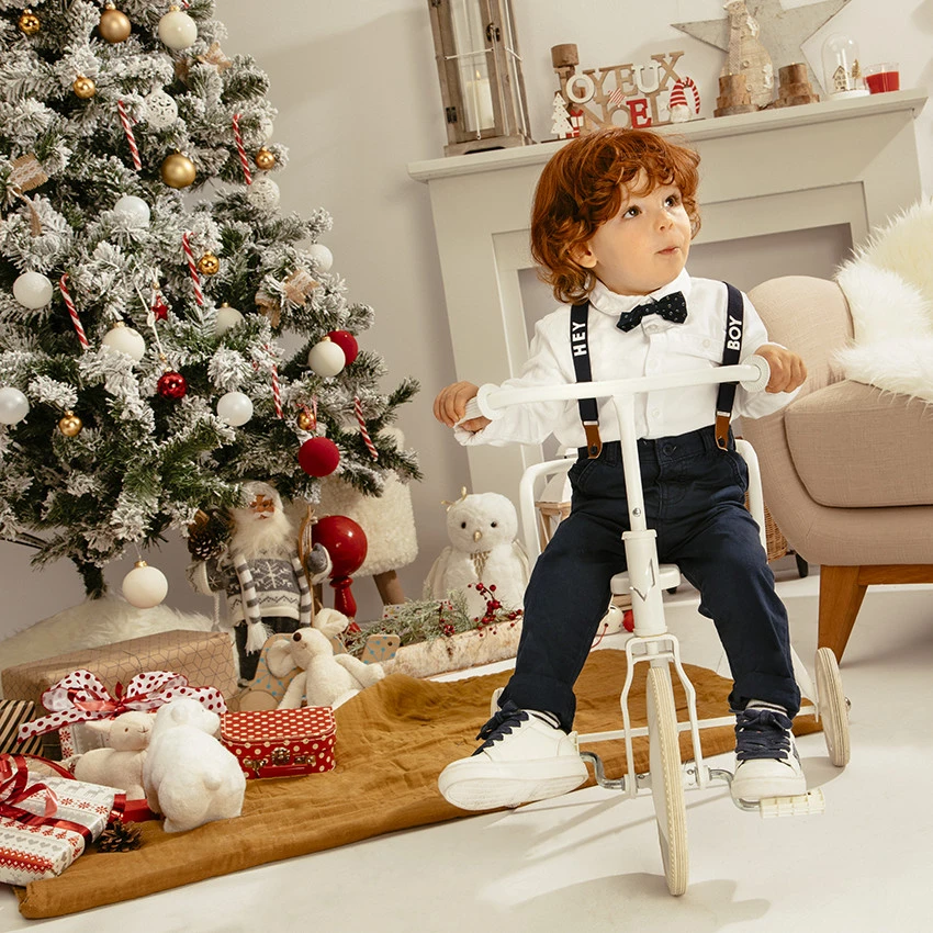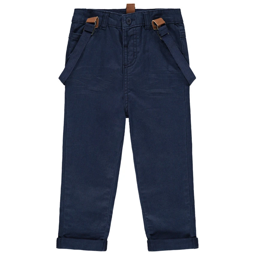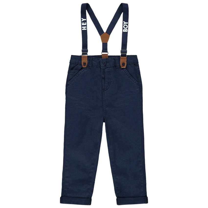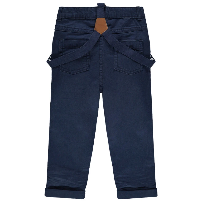 Pantalon en coton uni. Taille ajustable de l’intérieur par élastique et boutons. Ceinture à passants avec bouton et braguette zippée. 2 poches italiennes. 2 poches plaquées au dos. Bretelles élastiquées amovibles avec inscriptions.