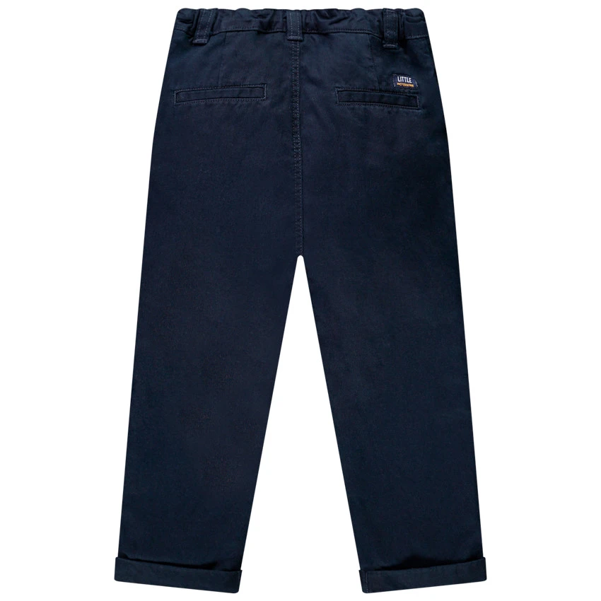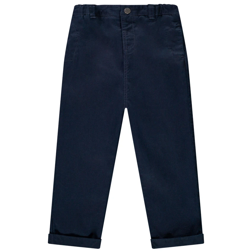 Pantalon en toile. Taille à passants ajustable de l’intérieur par élastiques et boutons. 2 poches devant. 2 poches passepoilées au dos.
