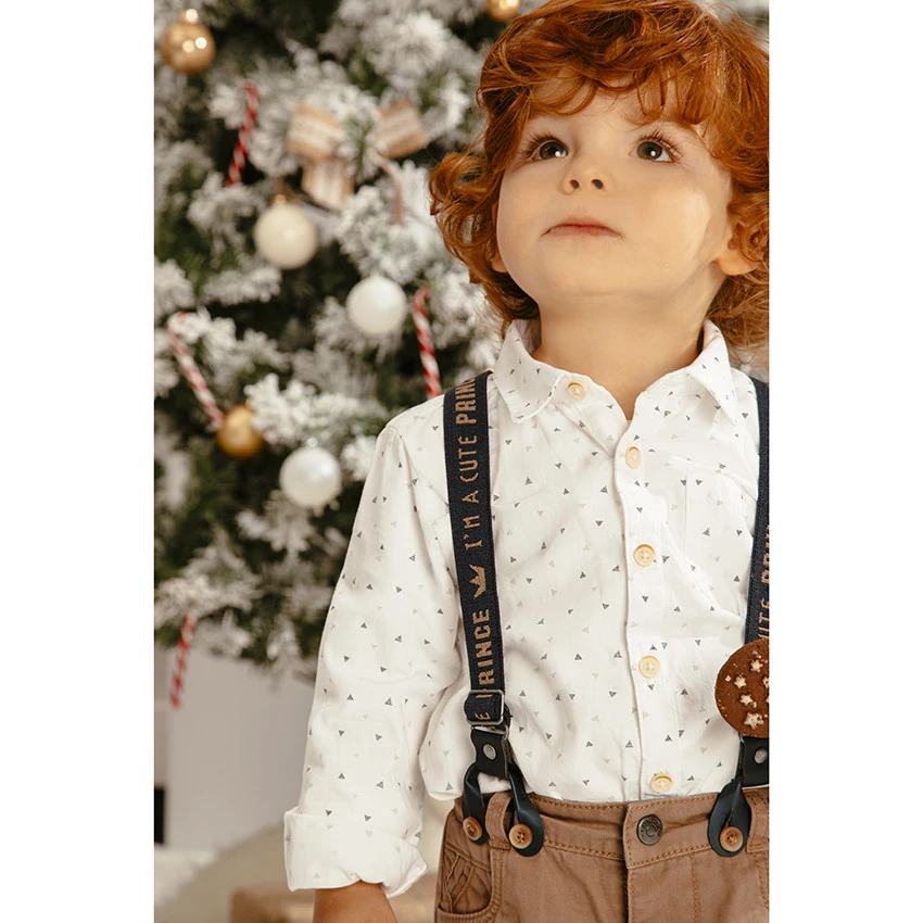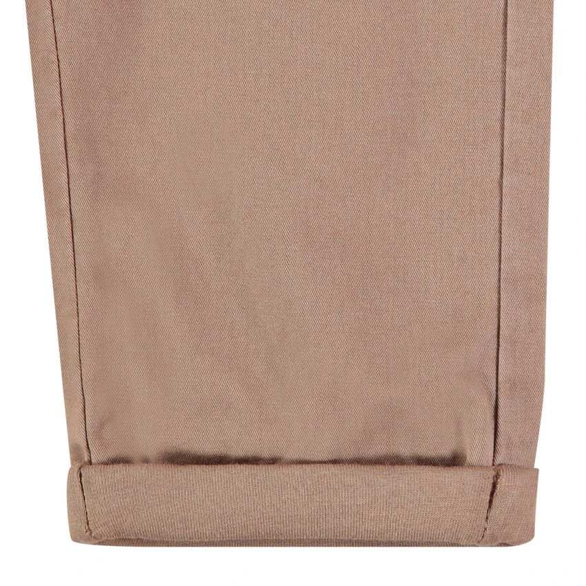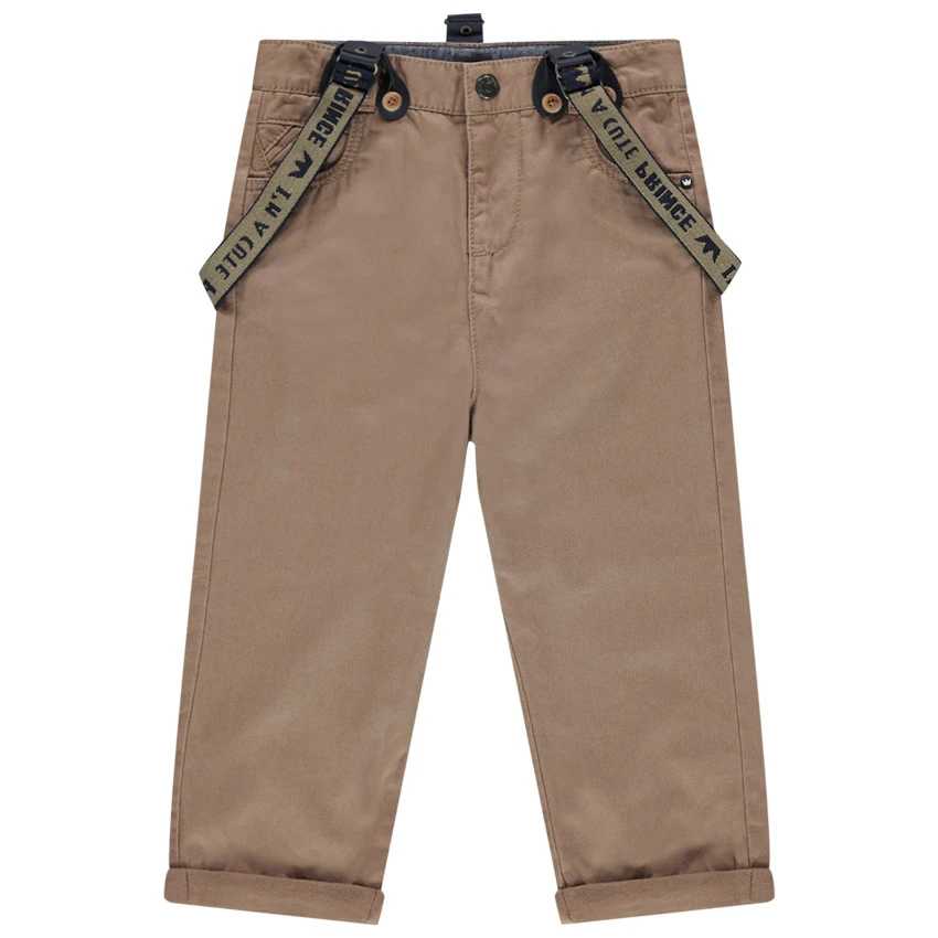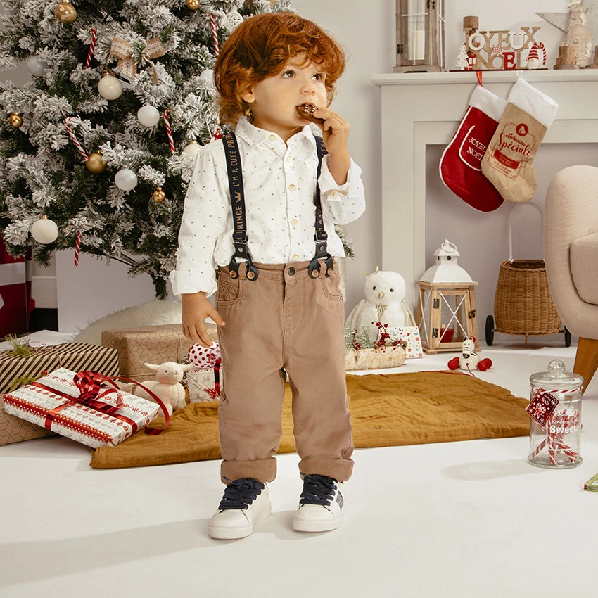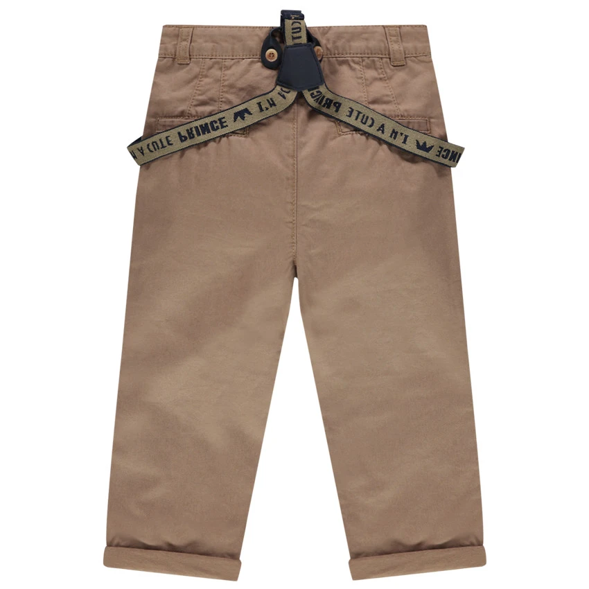 Pantalon uni en toile. Coupe droite. Taille ajustable de l’intérieur par élastique et boutons. Bretelles ajustables amovibles par boutons. 2 poches cavalières devant. 2 poches passepoilées au dos.