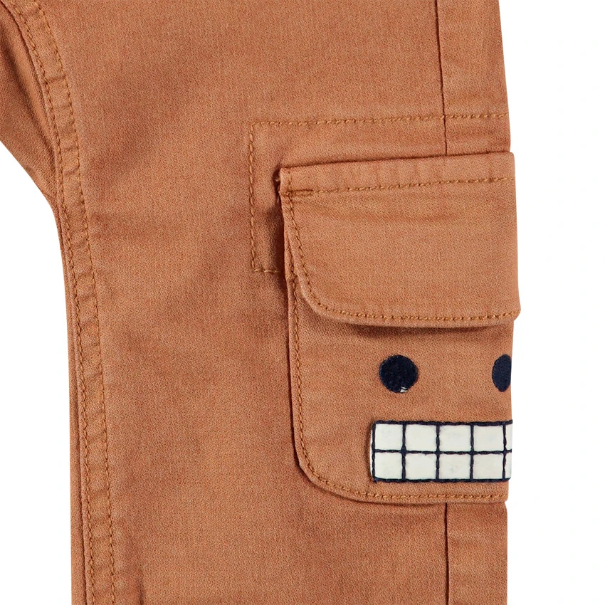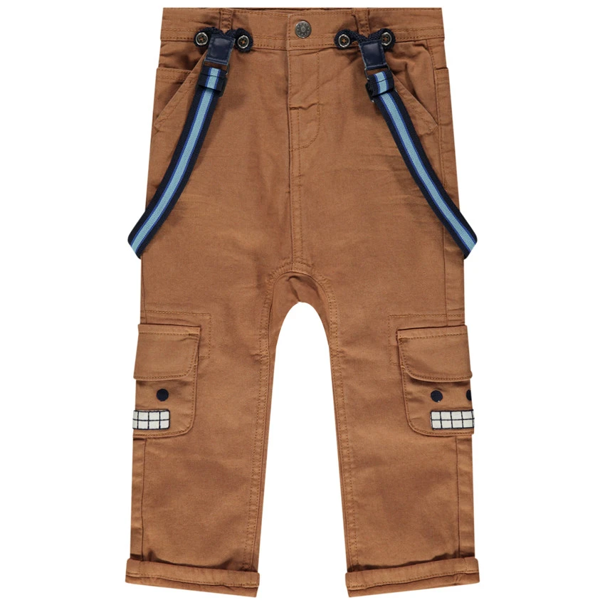 Pantalon en toile effet crinkle. Taille ajustabe de l’intérieur par élastique et boutons. Bretelles élastiquées amovibles. 2 poches à rabat sur les jambes avec détails brodés robot. 1 poche passepoilée au dos.