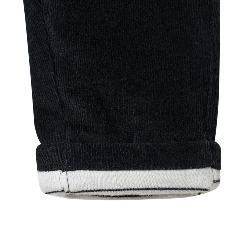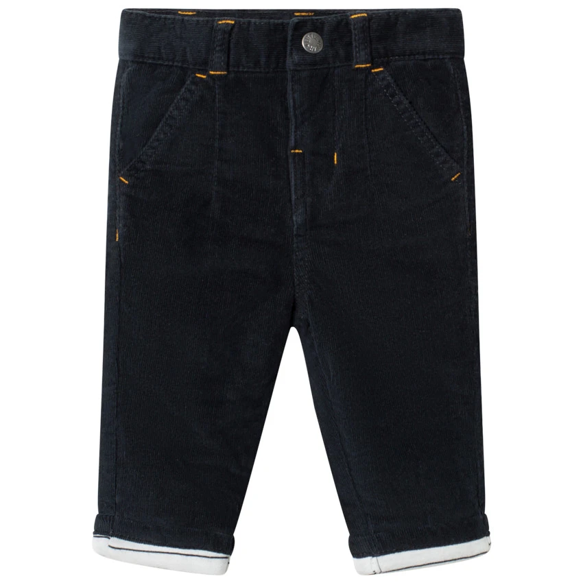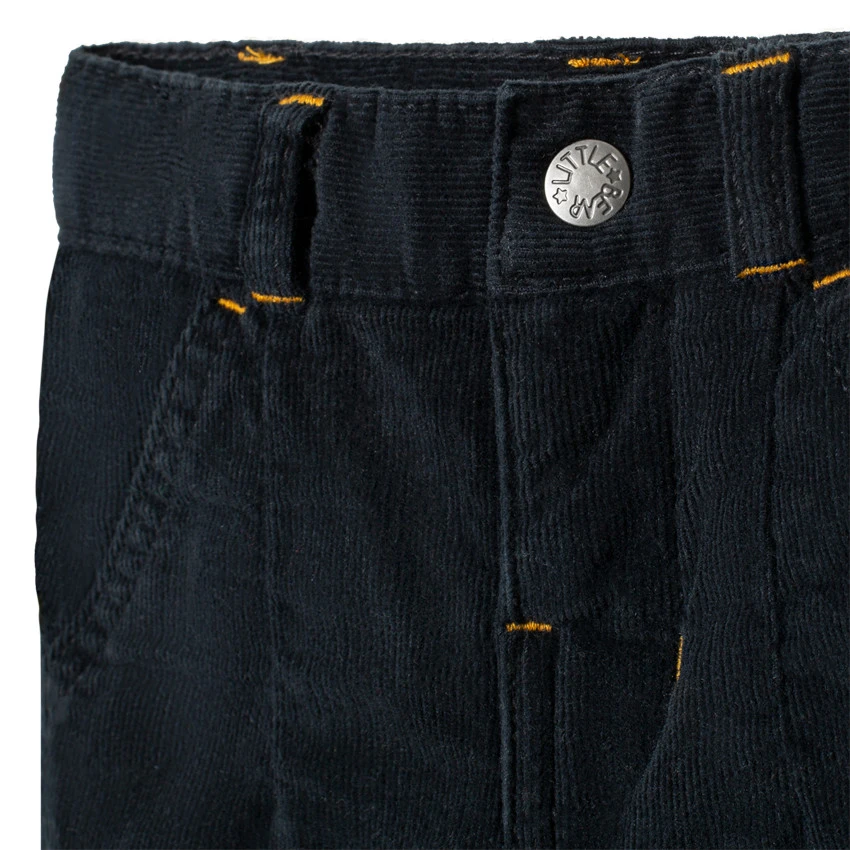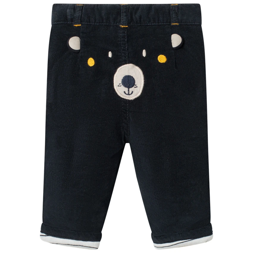 Pantalon en velours doublé à rayures. Taille ajustable de l’intérieur par élastique et boutons. Ceinture à passants avec bouton et braguette zippée. 2 poches italiennes devant. Ours brodé au dos.
