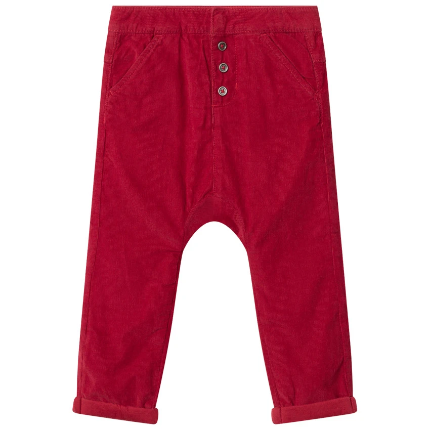 Pantalon en velours ras. Doublure en jersey. Taille ajustable de l’intérieur par élastique et boutons. Ceinture à passants avec bouton et braguette zippée. 2 poches italiennes. Ouverture boutonnée devant.