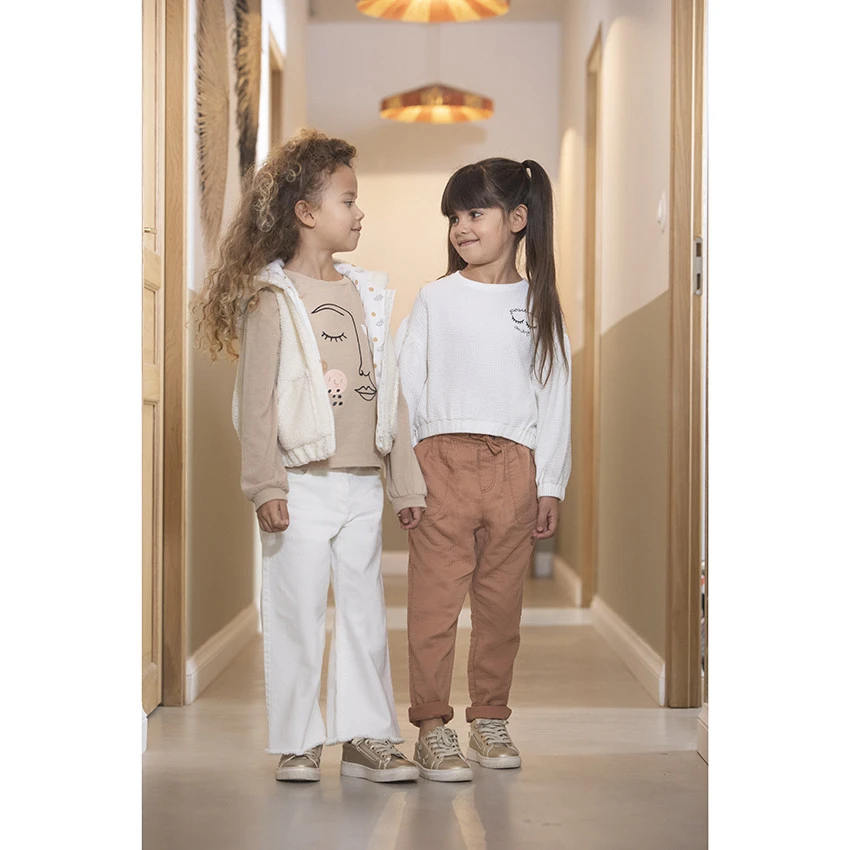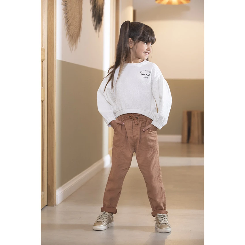 Pantalon jogger pour enfant fille. Taille élastiquée avec liens à nouer pour une tenue optimale. 2 poches devant. 1 poche passepoilée au dos. Revers fixes.